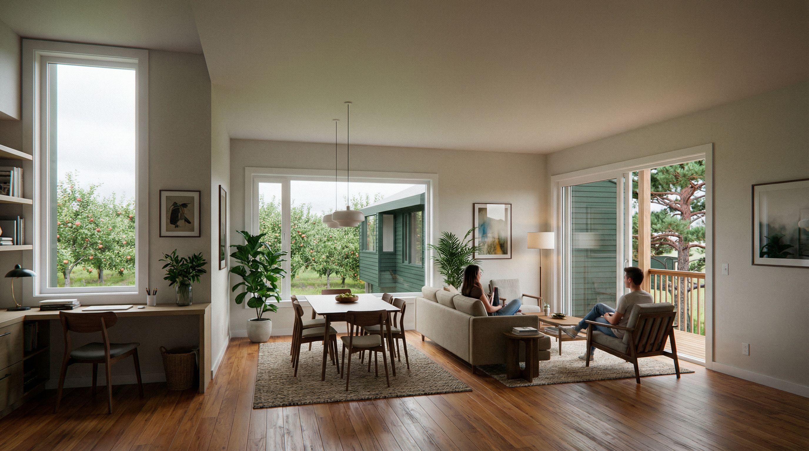 Promptmodern living and eating area, built in desk hardwood floors and area carpet, painted walls and ceilings, looking out to orchard, white windows and dark green siding to unit that is visible outdoors. Scots pine tree off deck right side. Follow room geometry , keep exact camera angle