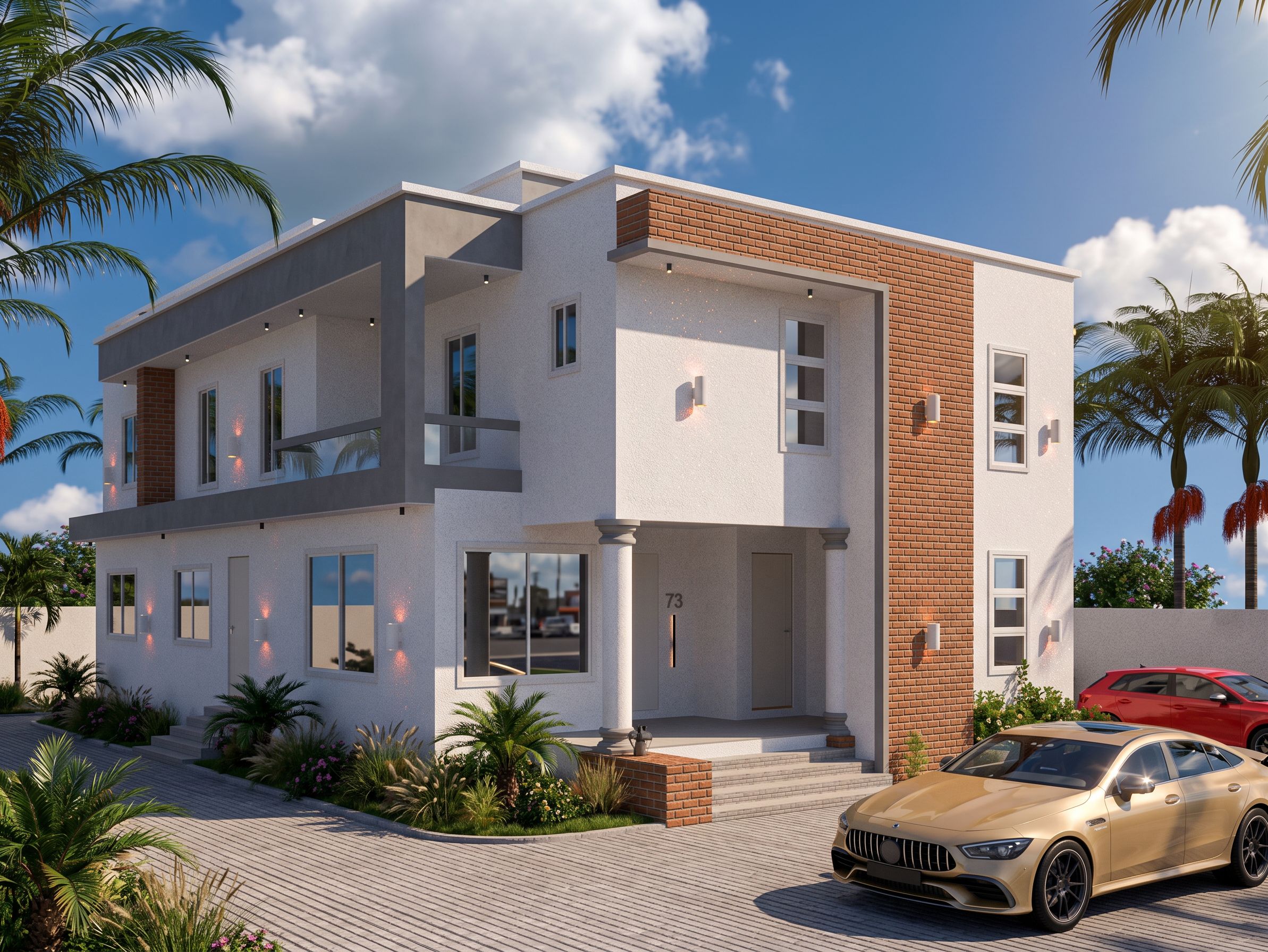PromptPhoto of a modern two-story residential building featuring a blend of clean lines and textured materials. Highlight the white facade contrasted by warm brick accents, large windows reflecting natural light, and lush greenery at the base. Set in an urban landscape with palm trees framing the scene under a bright blue sky. Soft shadows created by afternoon sunlight enhance the architectural details. Captured from a slightly elevated angle for a dynamic perspective, utilizing a wide-angle lens to amplify the building's prominence within its surroundings., keep exact camera angle