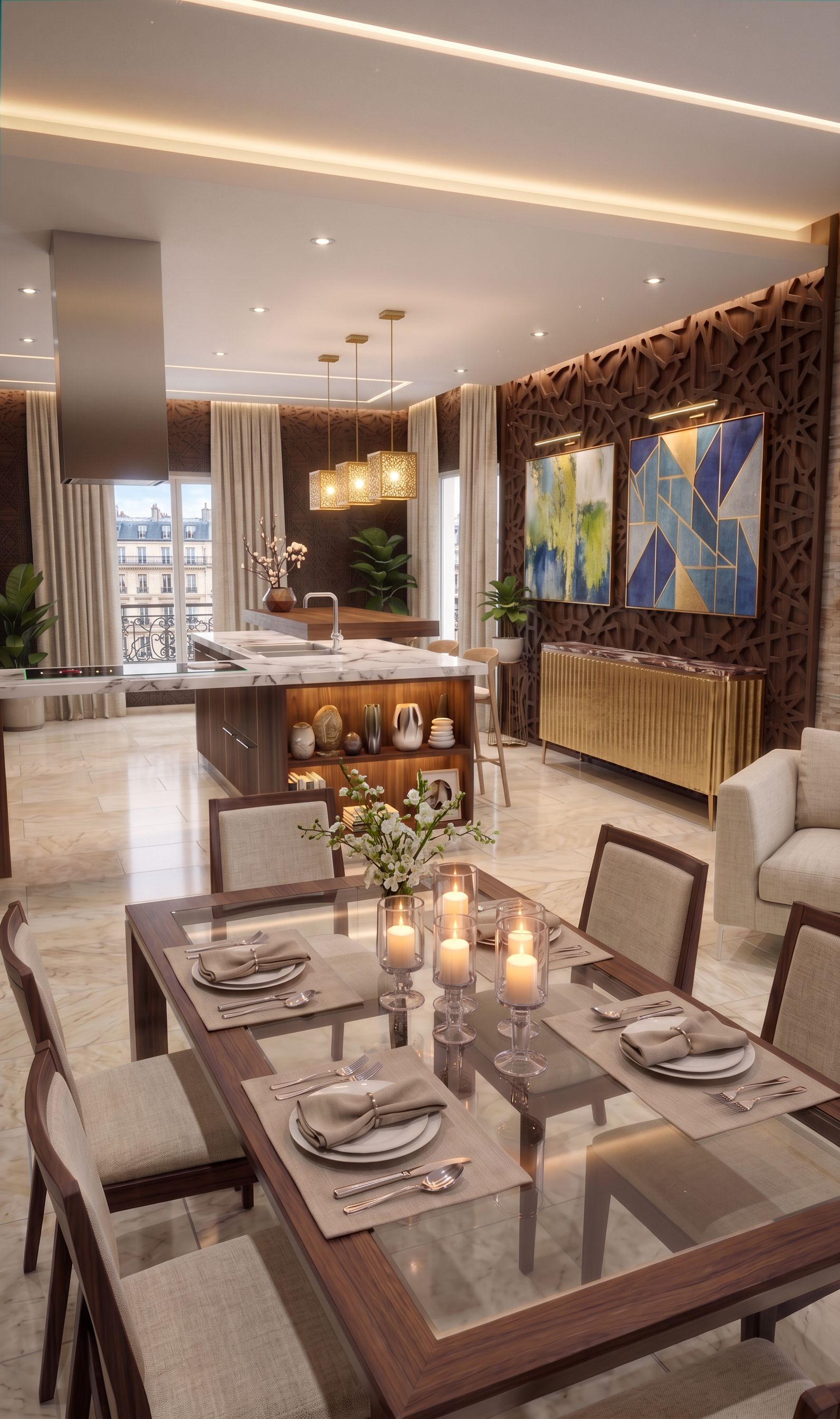 Promptcambia el tejido texturado de las cortinas por uno beige claro fresco y que haga juego con la tapicería de las sillas que sean de estilo escandinavo y utilizando misma tela en el sillón. abre las cortinas para que se vean edificios elegantes y típicos de Paris Elimina el bonsay elimina la televisión añade una sutil decoración floral en la mesa del comedor., keep exact camera angle