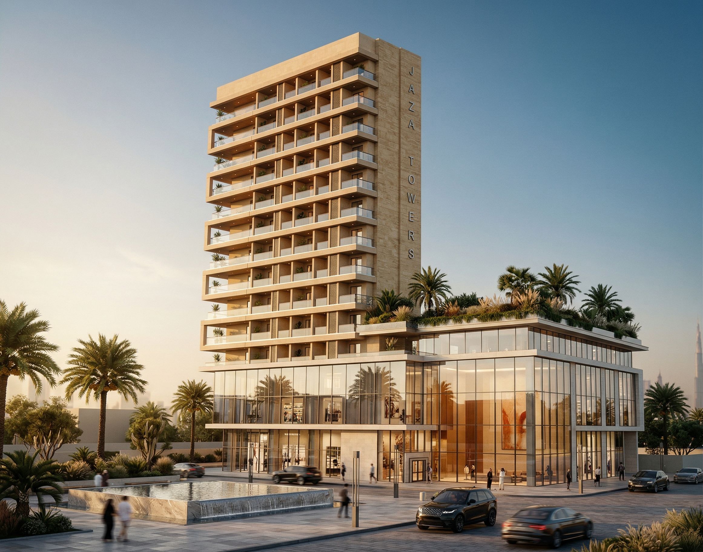 PromptUltra luxury contemporary high-rise building in Dubai, 4 floor commercial podium at base with retail shops and double height glass lobby, residential tower above, clean simple geometric design, minimal style, warm neutral colors (beige sand ivory), high-end materials (stone marble glass metal), large glass windows and balconies, soft golden hour lighting, palm trees and landscape, water feature at entrance, modern elegant look, realistic, 8k render, keep exact camera angle