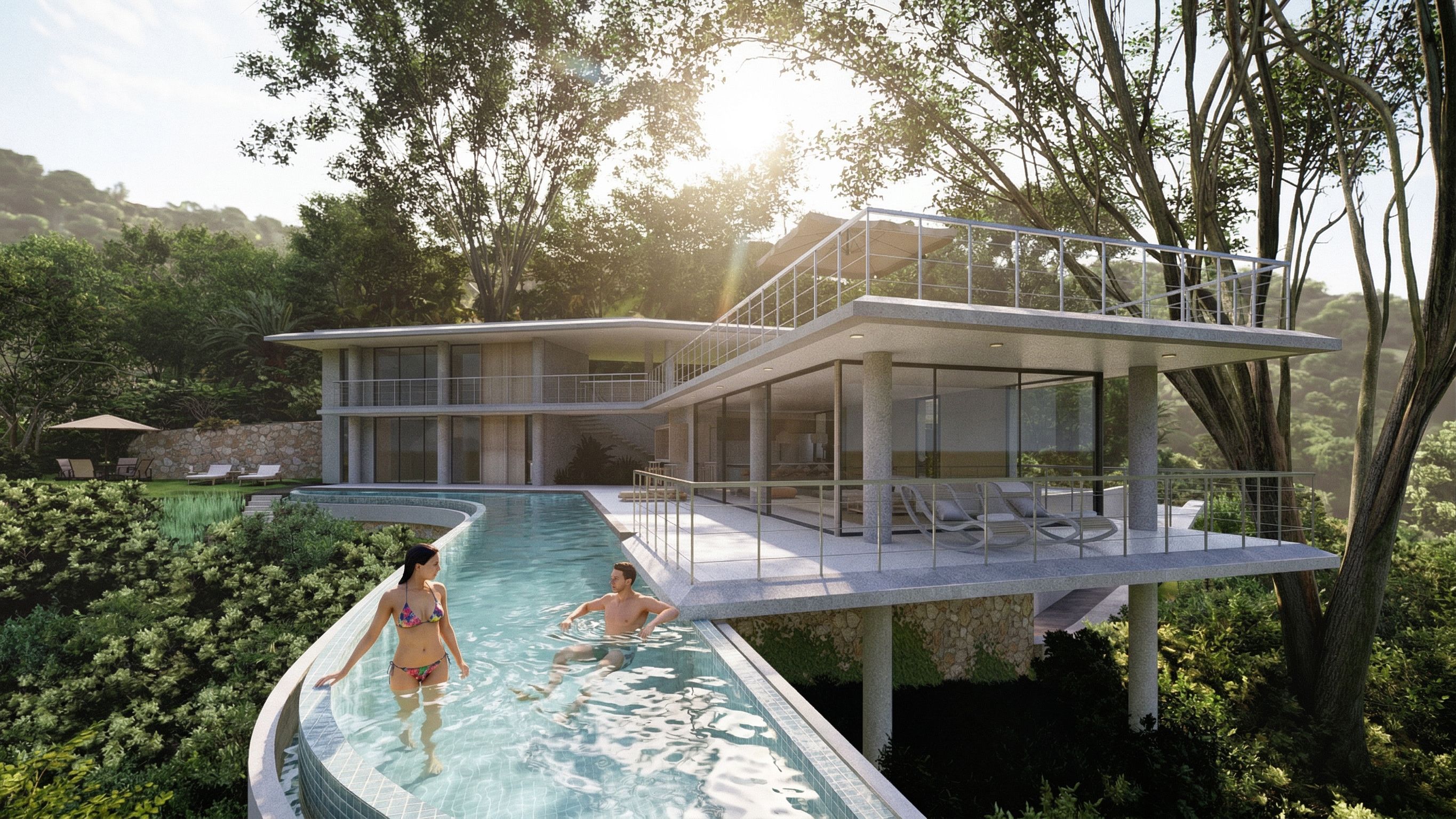Promptmodern beach house, people in swimwear in the pool, keep exact camera angle