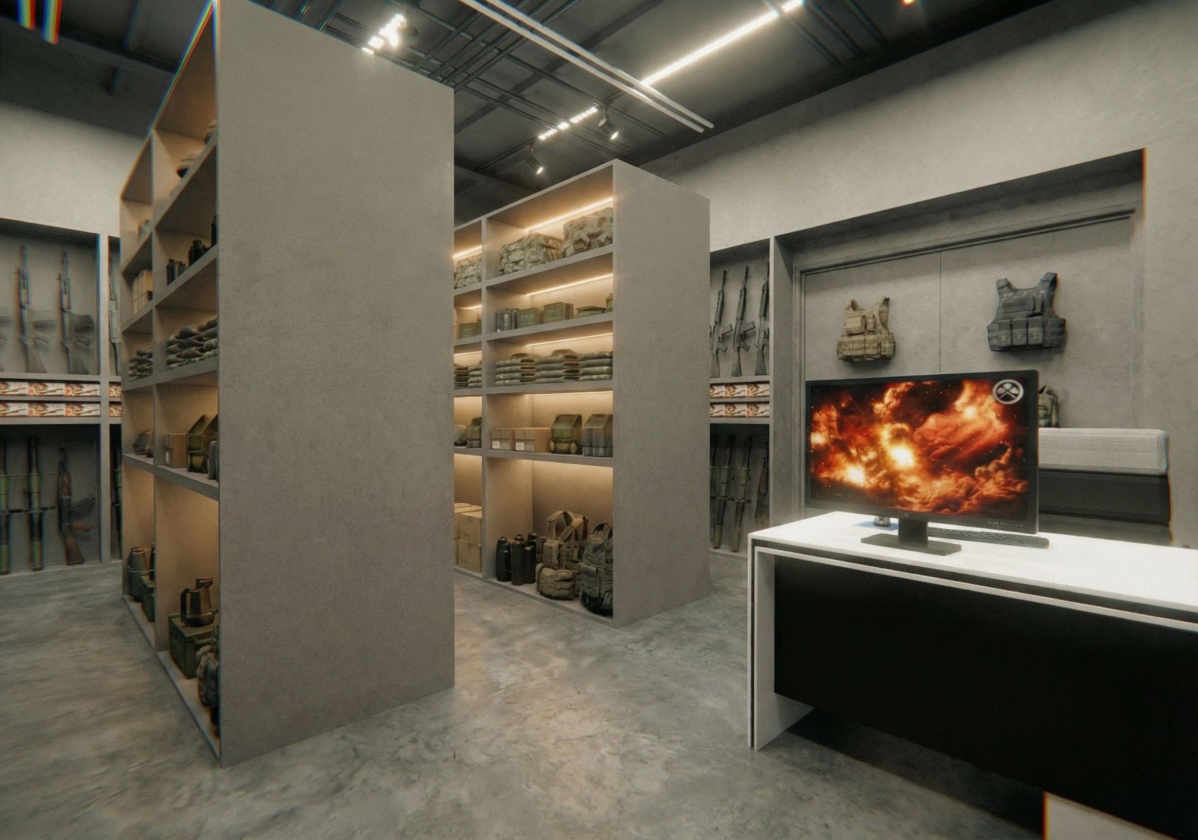 Promptporfavor añade la misma decoracion e iluminacion que hicimos en la imagen anterior pero utilizando el angulo y amplitud de la nueva imagen no puedes cambiar la distribucio solo agregar las armas y lo de los entrepaños de los muebles , keep exact camera angle