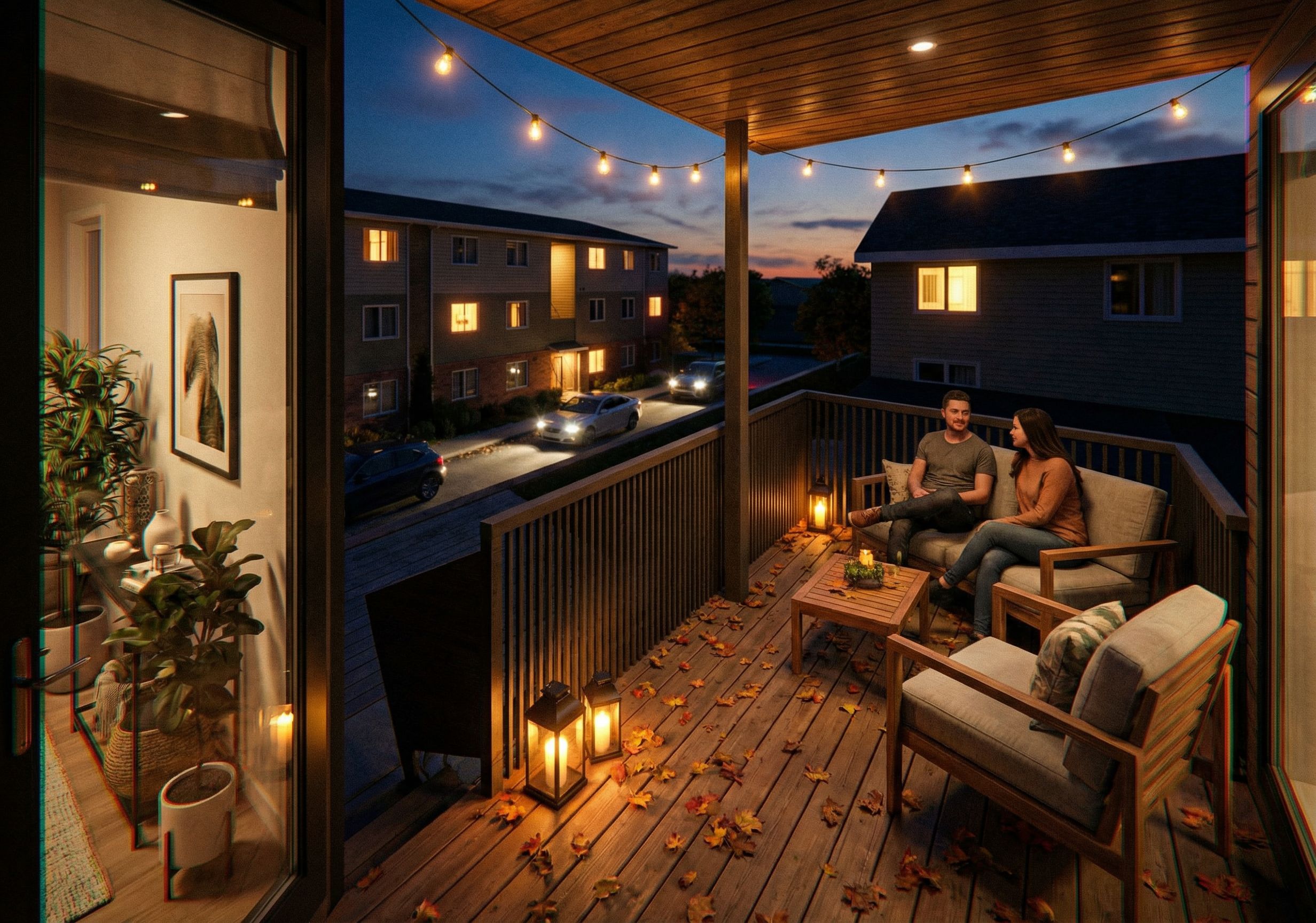 PromptOutdoor wood roof deck overlooking lane with cars and three storey block across, outdoor patio furniture Fall leaves with couple sitting on deck awaiting company , keep exact camera angle