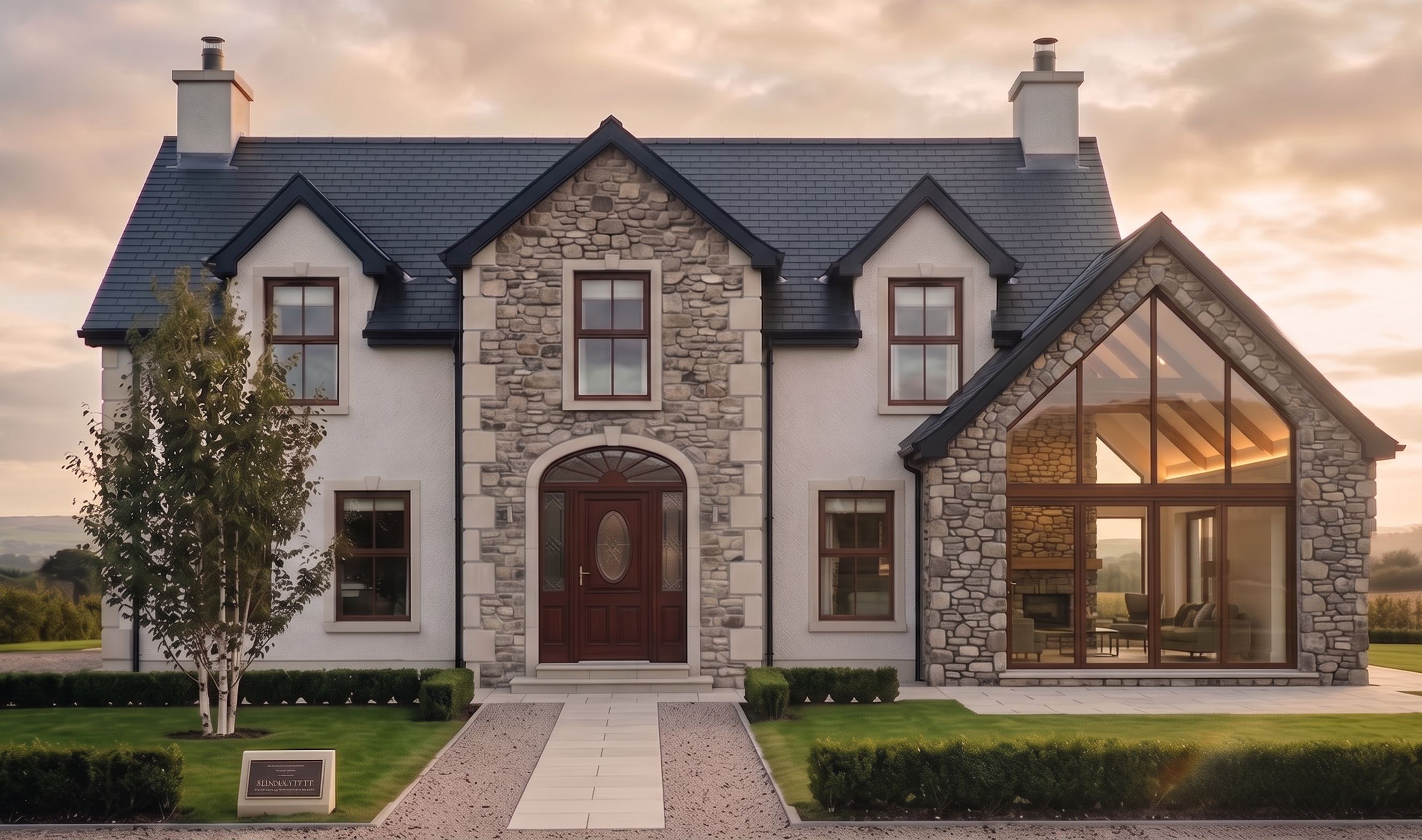 PromptCan you create an extension on to the right side of the house, make no changes to the main structure of the house. Use stone and a large apex window., keep exact camera angle