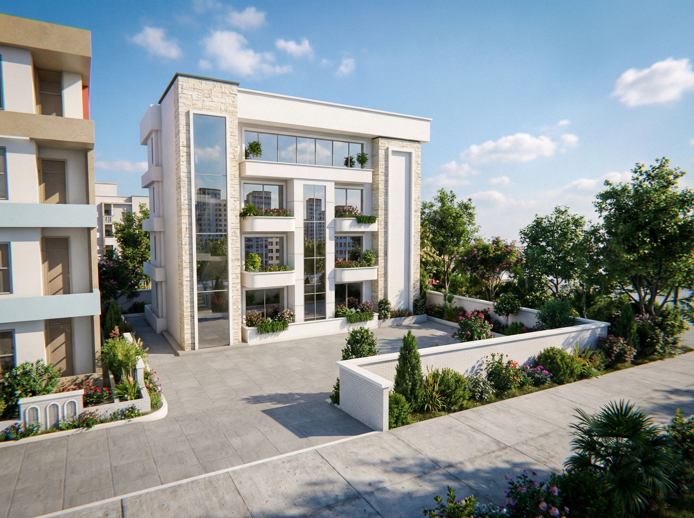 Promptmodern residential apartment in an urban residential housing,natural vegetation,lighting,clear resolution,white paint on walls and clear stone where is put, keep exact camera angle