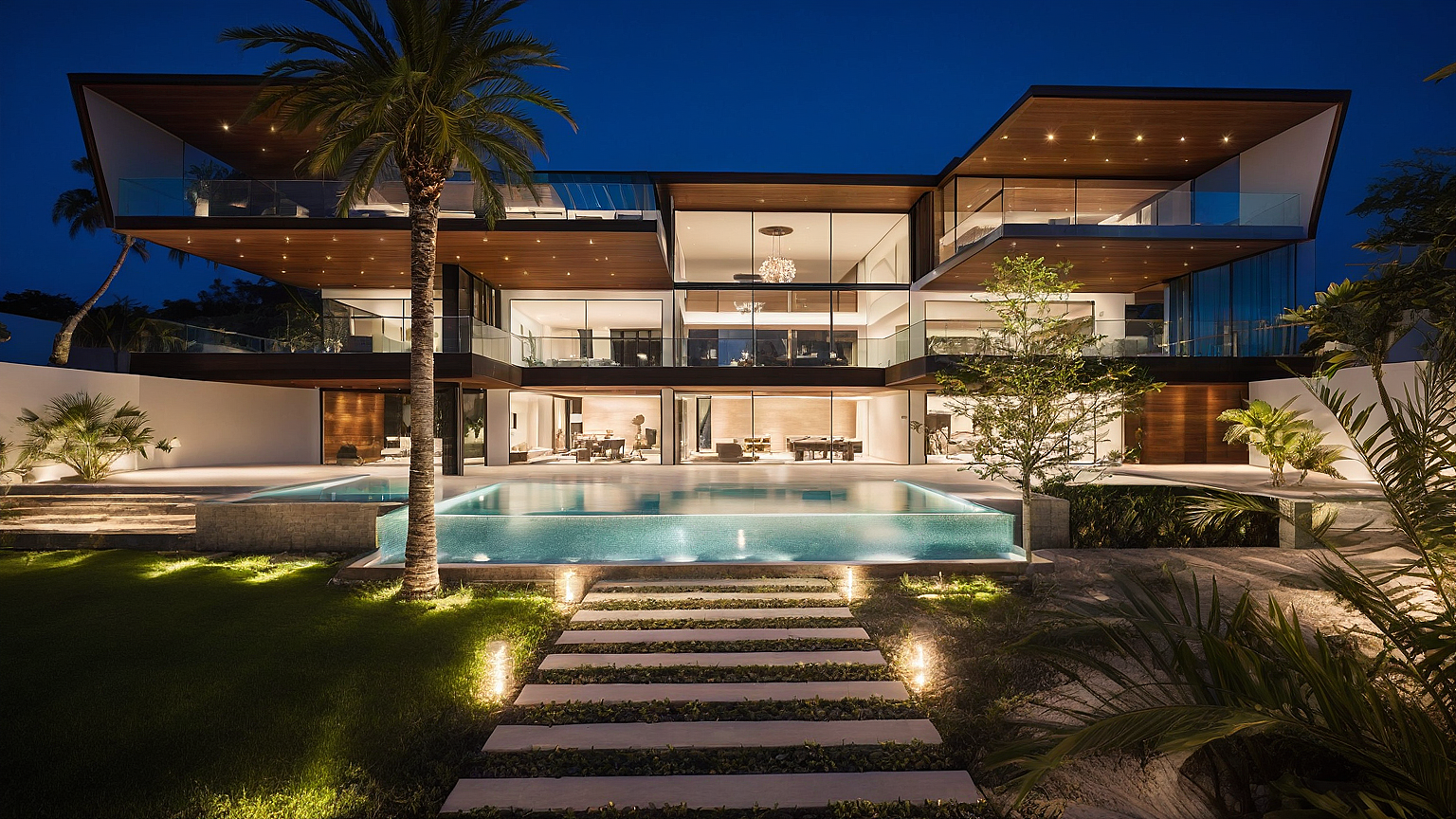 This is a modern luxury villa featuring a bold architectural design with clean lines, cantilevered structures, and expansive glass walls. The house is symmetrically designed, with two large overhanging wings extending outward, supported by a mix of wood, steel, and glass elements. A stepping stone pathway leads through a manicured green lawn toward an infinity pool that reflects the warm ambient lighting of the house. The glass railings on the balconies enhance the open, floating effect of the upper floors, while warm wood paneling and metal framework create a sophisticated contrast against the white walls. The outdoor spaces include lush tropical landscaping with palm trees and accent lighting, enhancing the villa’s resort-like ambiance. The large floor-to-ceiling glass windows seamlessly connect the indoor and outdoor living spaces, giving the house a futuristic yet inviting feel. Likely Materials Used in the Villa: Structure & Façade: A combination of reinforced concrete, steel beams, and glass for a sleek and floating appearance. Wood Paneling: High-end composite wood cladding or teak for the rich brown sections, adding warmth to the design. Glass Railings & Windows: Tempered glass used extensively for an open and airy aesthetic. Flooring: Likely travertine, polished concrete, or marble for the outdoor areas, while the interior floors could feature high-end tile or hardwood. Pool & Water Feature: The infinity pool appears to use porcelain or glass mosaic tiles, with a stone retaining wall for contrast. Lighting & Accents: Recessed LED lighting embedded in the overhangs and pathways for a modern ambiance. Motion Prompt for Kling AI Turning Motion: "A smooth cinematic turning shot around a luxurious modern villa with cantilevered overhangs and glass walls. The camera gently rotates, revealing the seamless indoor-outdoor flow, warm ambient lighting, and the infinity pool reflecting the architecture. The movement accentuates the floating balconies, lush landscaping, and dramatic overhangs, enhancing the villa’s grandeur."