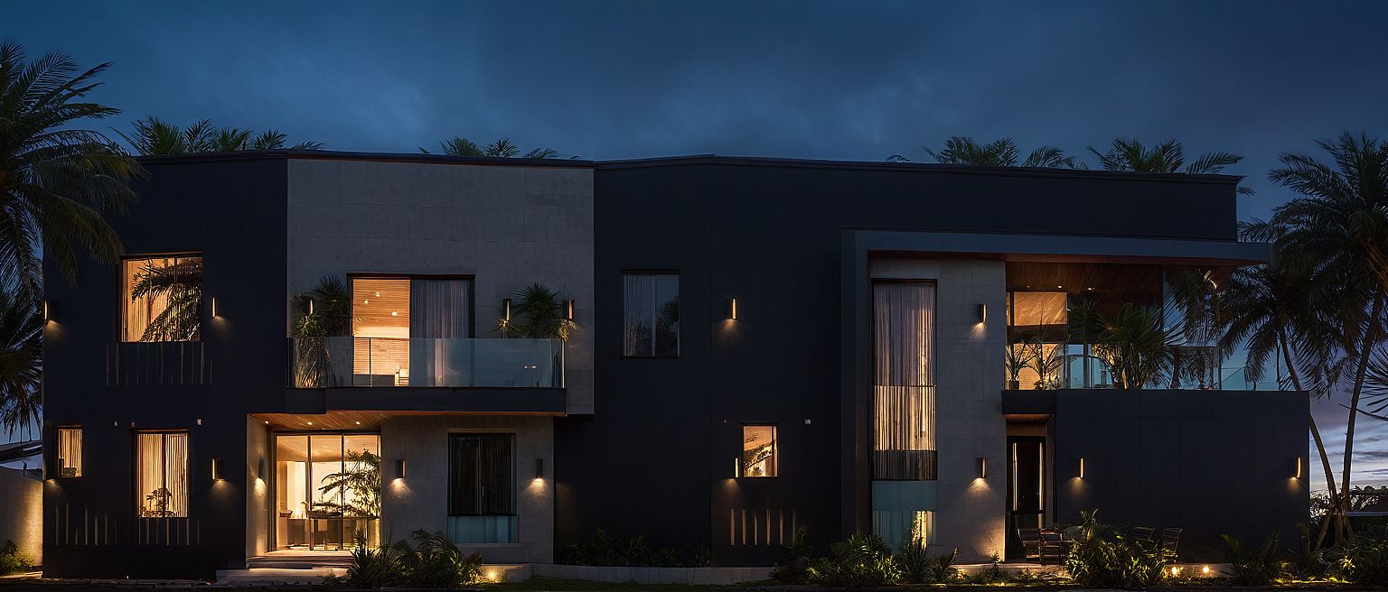 PromptPhoto of a modern residential building featuring a blend of concrete and dark façade elements. Highlight the large, reflective windows, and unique balcony design. Surrounded by lush palm trees and vibrant landscaping, set against a backdrop of a twilight sky. Soft artificial lighting casts warm glows on the structure, enhancing its architectural details. Capture the scene from a low angle, showcasing the building's height and dramatic shadows, with a slight fisheye lens effect to emphasize its contemporary design.