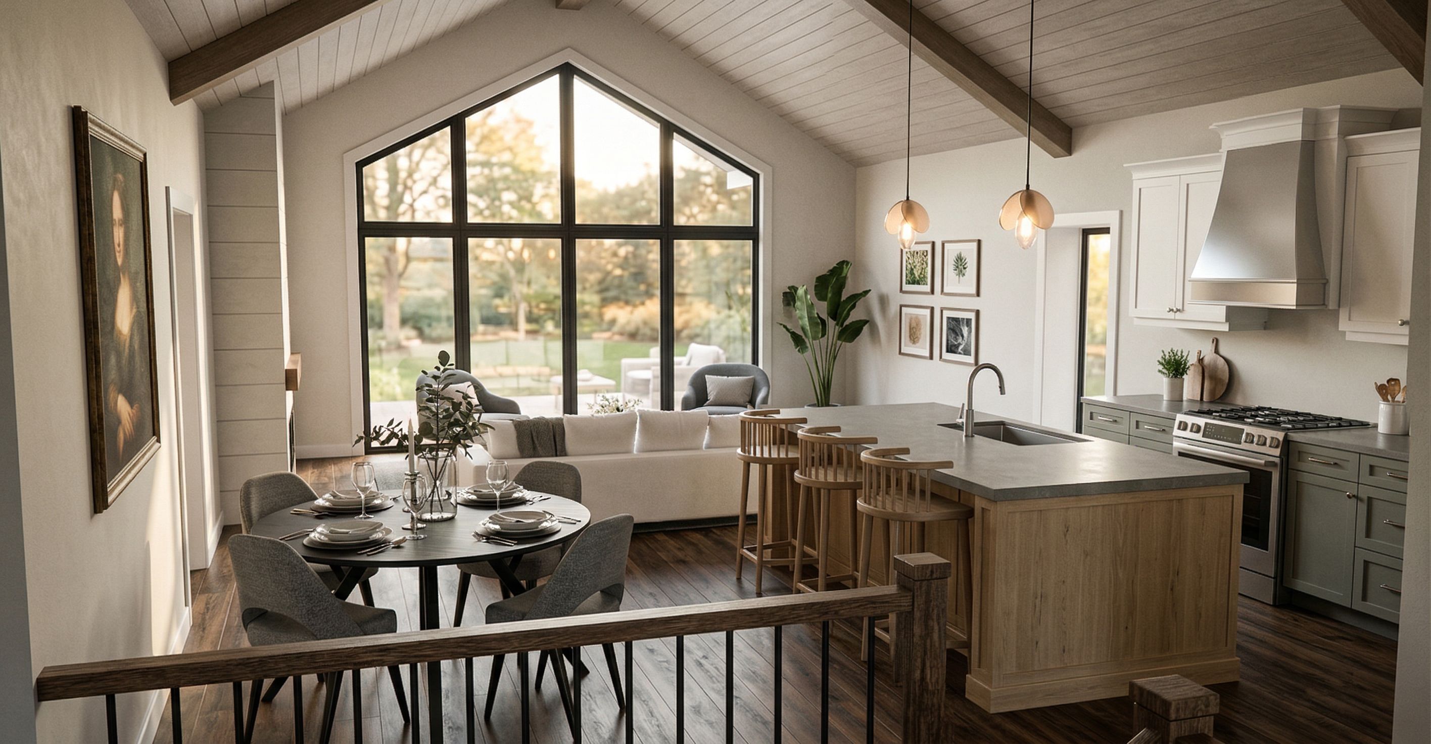 PromptPhoto of a modern open-concept living space, featuring a spacious living room with a large, vaulted ceiling and expansive windows that offer vibrant natural light. Emphasize the juxtaposition of warm wood textures against sleek cabinetry and stainless steel appliances in the kitchen area. Include stylish furniture elements like a round dining table and comfortable sofas. The scene is set in a cozy, inviting atmosphere during the afternoon light, casting soft shadows. Captured from a slightly elevated angle with a wide lens to encompass the entire flow of the layout, highlighting its harmonious design. , keep exact camera angle