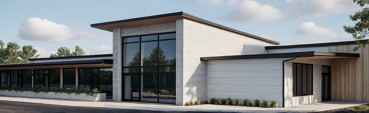 PromptMODERN BUILDING WITH WHITE BRICK, GREY RECTANGULAR METAL PANEL, AND LIGHT COLORED WOOD. THE ROOF SOFFITS ARE ALSO LIGHT WOOD. THERE IS LOTS OF TINTED GLASS IN BLACK FRAMES. THE LEFT SIDE OF THE IMAGE HAS A CONCRETE PLANTER WITH DENSE BUSHES GROWING IN IT