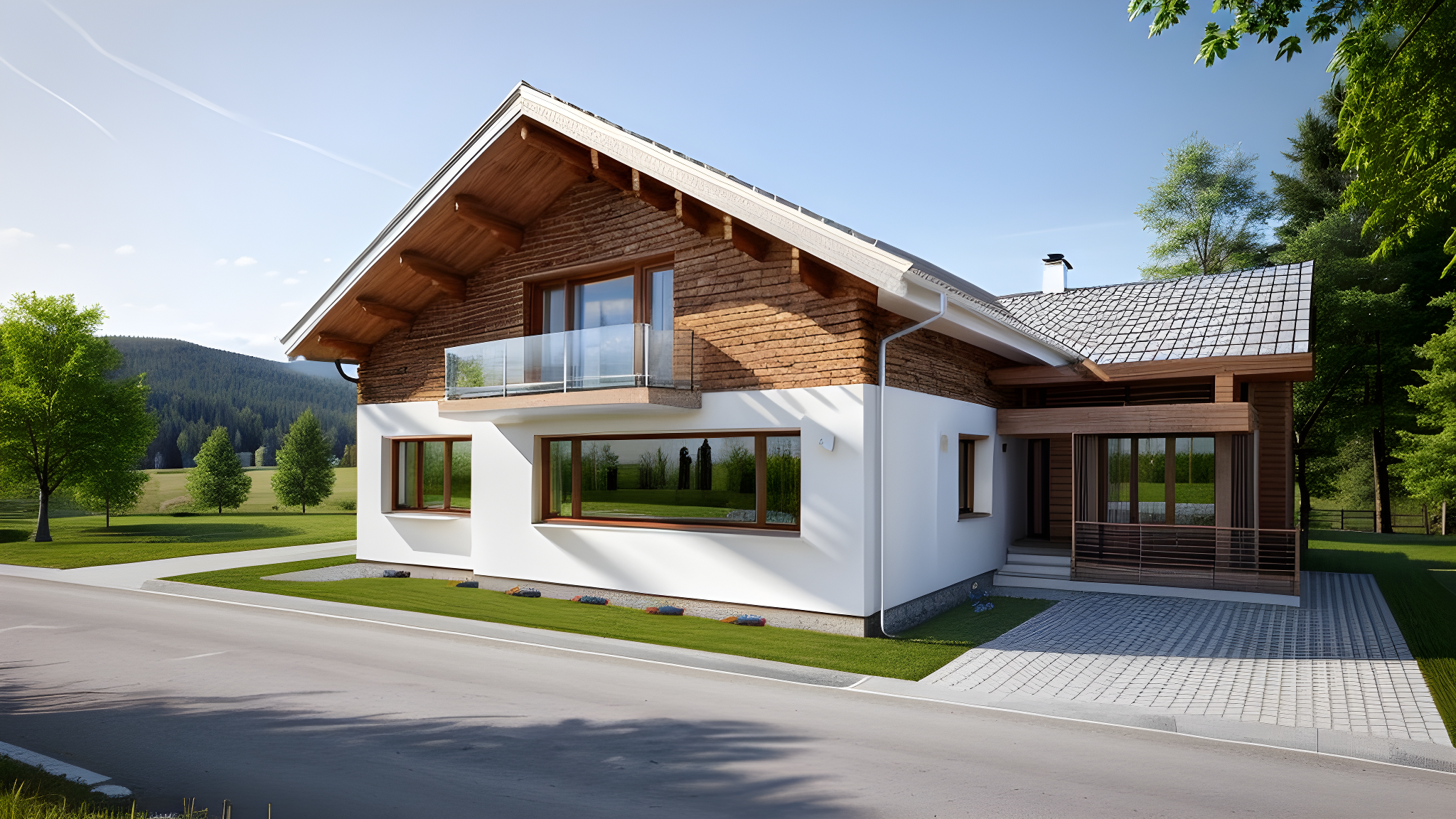 mountain house in Romania, wood on the facade, wood shutters, grass in front of the house, white plaster walls, three identical windows, modern touch