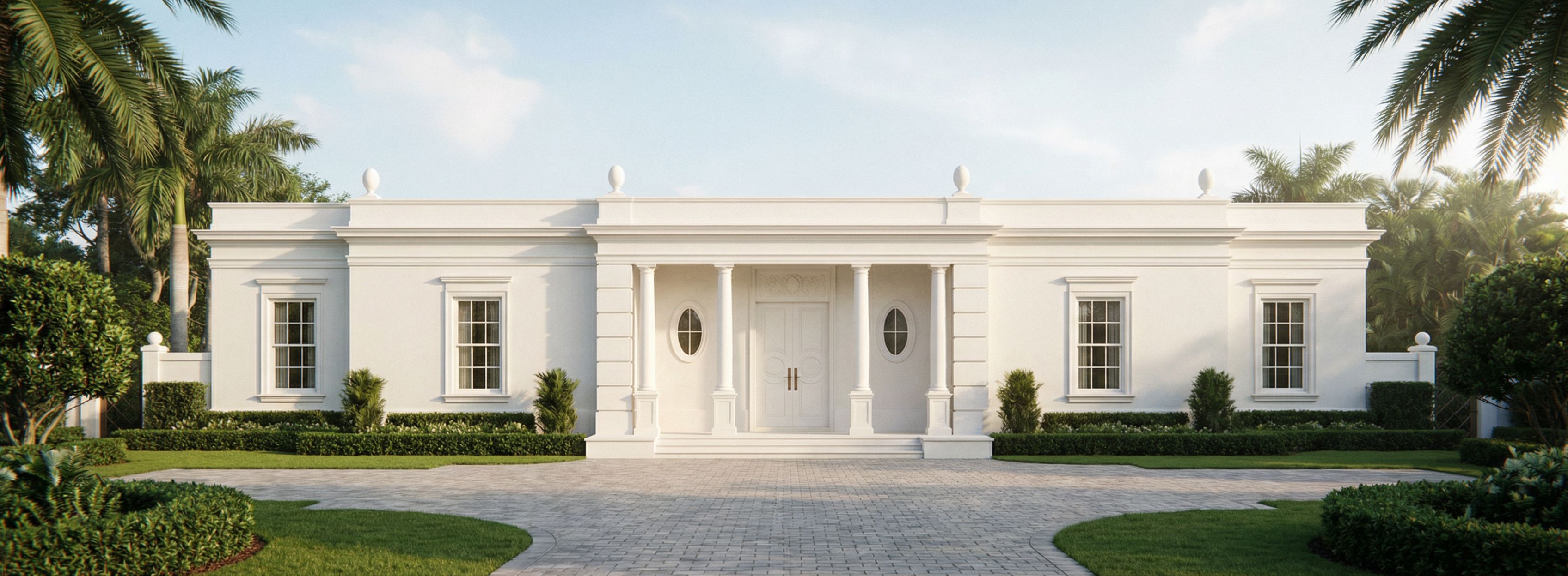 Single-story Neo-Classical Regency composition with a projecting central entry pavilion. Classical columns support a single entablature. Oval finials on roof in essential points that are in proportions with the rest of the house.