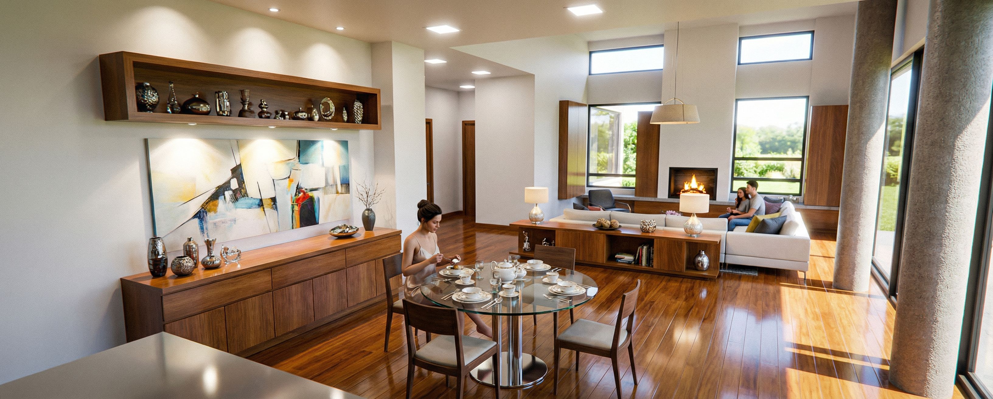 PISO EN MADERA BRILLANTE, MUEBLES EN MADERA SEMI BRILLANTE, MUEBLE DE LA IZQUIERDA CON CUADRO MODERNO BIEN ANCHO CON 3 SPOTS DE LUZ, OBJETOS DE DECORACION EN EL MUEBLE SUPERIOR Y EN EL INFERIOR, MESA DE COMEDOR REDONDA CON TAPA DE VIDRIO Y BASE EN ACERO BRILANTE MODERNA CON JUEGO DE LOSA ELEGANTE CON 4 SILLAS, UNA MUJER EN BABY DOLL SENTADA COMIENDO. AL FONDO EN LA SALA SOFA EN L BLANCO CON COJINES MIRANDO HACIA LA CHIMENEA Y UNA PAREJA JOVEN SENTADA, CHIMENEA PRENDIDA Y CON LA FORMA EXACTA QUE APARCE EN LA IMAGEN. LAMPARA COLGANTE EN LA SALA, ILUMINACION LED EMPOTRADA DE FORMA CUADRADA EN EL TECHO DEL COMEDOR. PAREDES EN PINTURA BLANCA ACETINADA, EXTERIOR MOSTRANDO UN DIA SOLEADO. COLUMNAS EN CONCRETO APARENTE, CORREDOR DE LAS ALCOBAS AL FONDO CON LAMPARAS LED DE FORMA CUADRADA EMPOTRADAS EN EL TECHO. 2 LAMAPARAS DE MESA EN EL MUEBLE ENTRE EL COMEDOR Y LA SALA Y OBJETOS DE DECORACION EN ESTE MISMO MUEBLE , keep exact camera angle