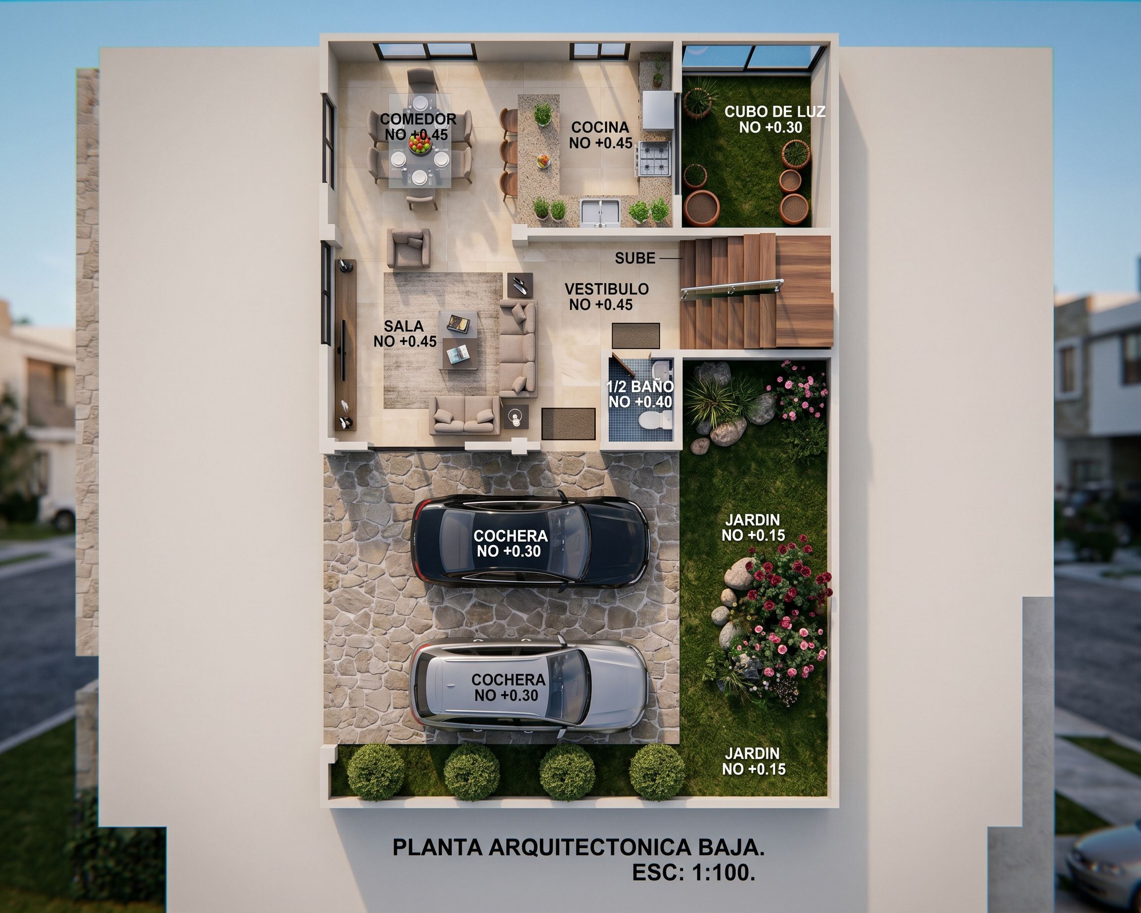 PLANTA BAJA HIPERREALISTA, SALA, COCINA, COMEDOR CON LOSETA EN COLOR BEIGE, CUBO DE LUZ CON PASTO NATURAL Y ALGUNOS MACETEROS, ESCALERA CON PISO DE MADERA, MEDIO BAÑO CON PISO DE AZULEJO COLOR AZUL, JARDINES CON PASTO ALGUNAS ROCAS Y VEGETACION VARIADA, ASI COMO PLANTAS DE ROSAS, LA COCHERA CON PISO DE PIEDRA NATURAL. RESPETAR CROQUIS, keep exact camera angle