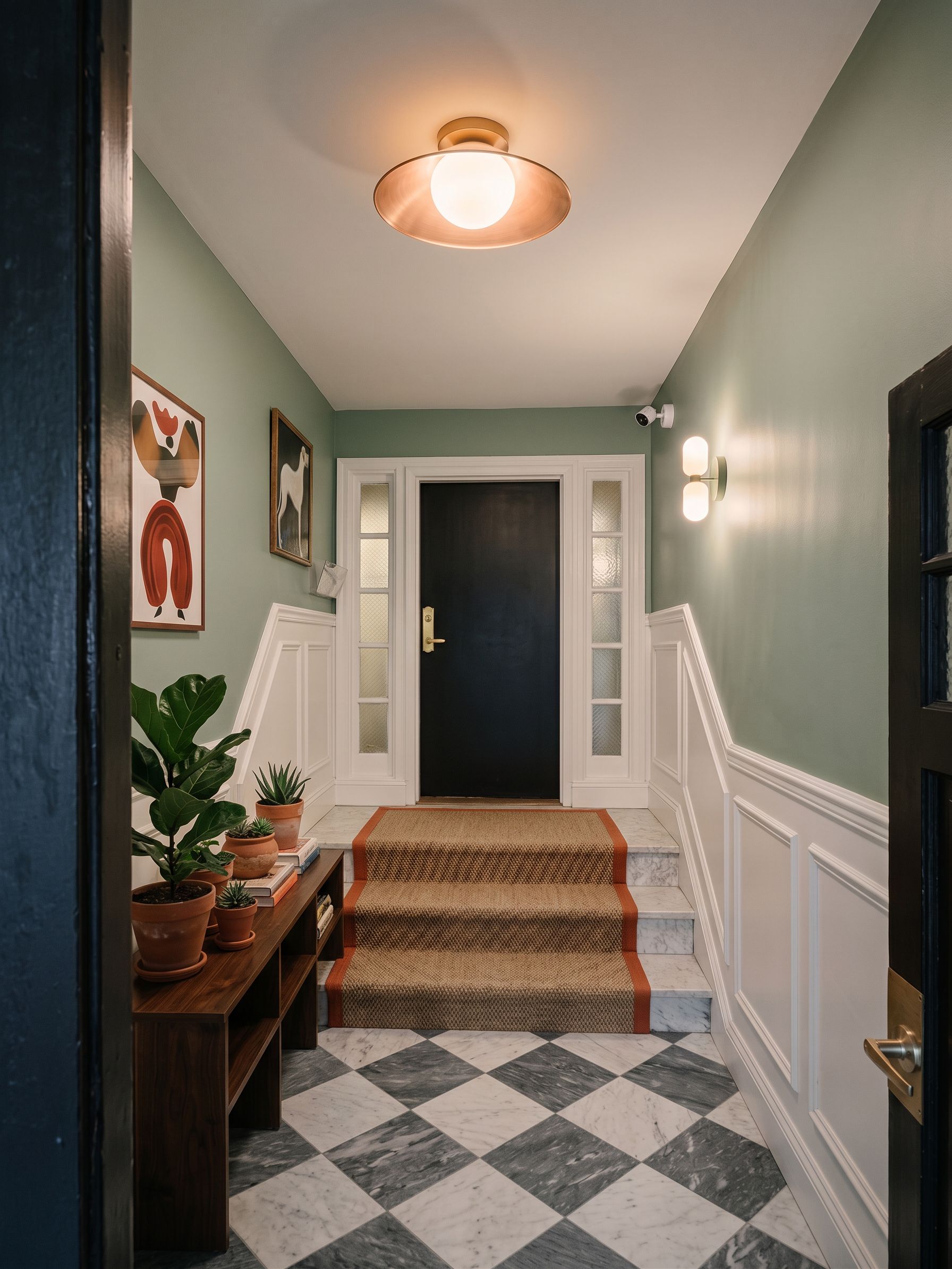 Refresh the entry to this apartment building to match the lobby in reference image 1 according to the mood board in reference image 2. The mailboxes should be removed. The marble stairs should remain. The marble on the walls will be removed. Light fixtures and flooring should be replaced., keep exact camera angle
