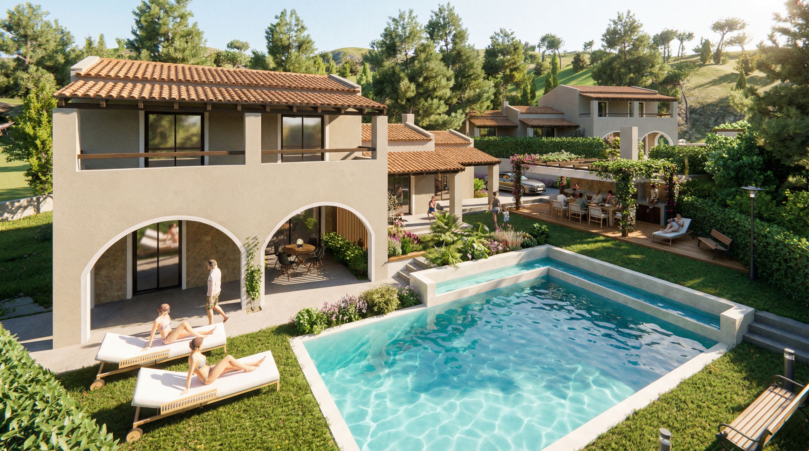 Photo of a contemporary villa surrounded by lush greenery, featuring smooth stucco walls and terracotta roof tiles. Highlight the elegant arches in the entrance, large glass windows, and a wooden pergola by the poolside. Set in a tranquil urban setting, accentuate the landscaped gardens and nearby hills. Natural daylight illuminates the scene, creating soft shadows and vibrant reflections in the swimming pool. Capture an aerial perspective with a wide lens to showcase the spacious layout, including lounging areas and outdoor amenities., keep exact camera angle