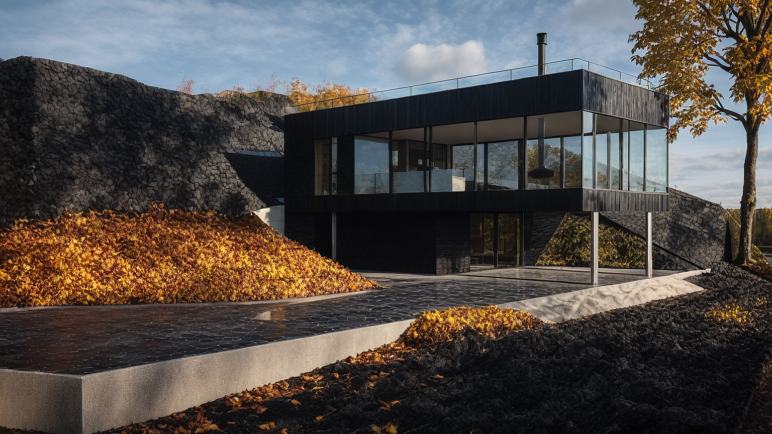 Promptautumn day, autumn forest background everywhere, reflective glasses, black charred wood cladding, non reflective paving