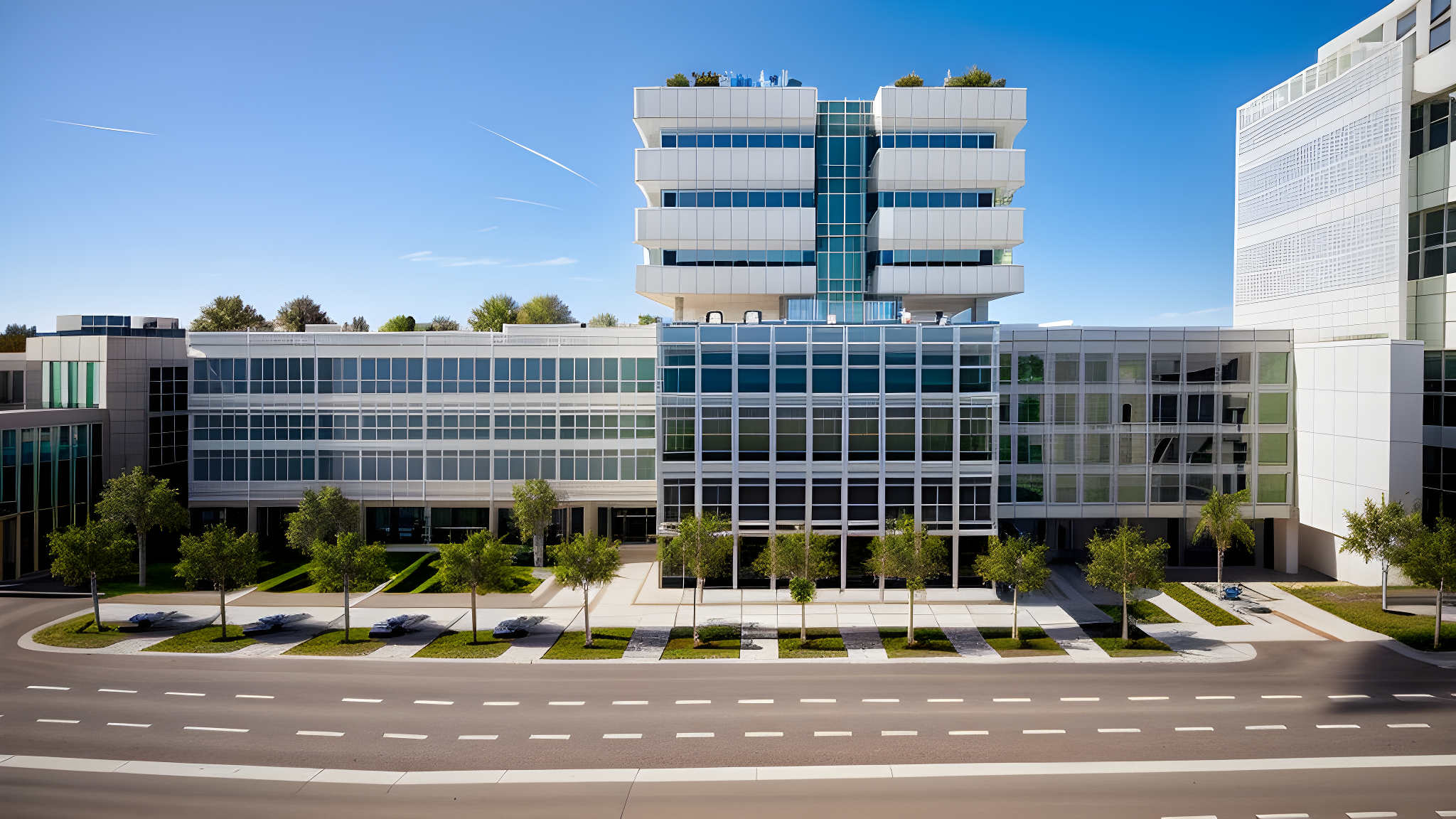 office building, white plaster facade and curtain wall, and grass and vegetation in front of the building, more glass