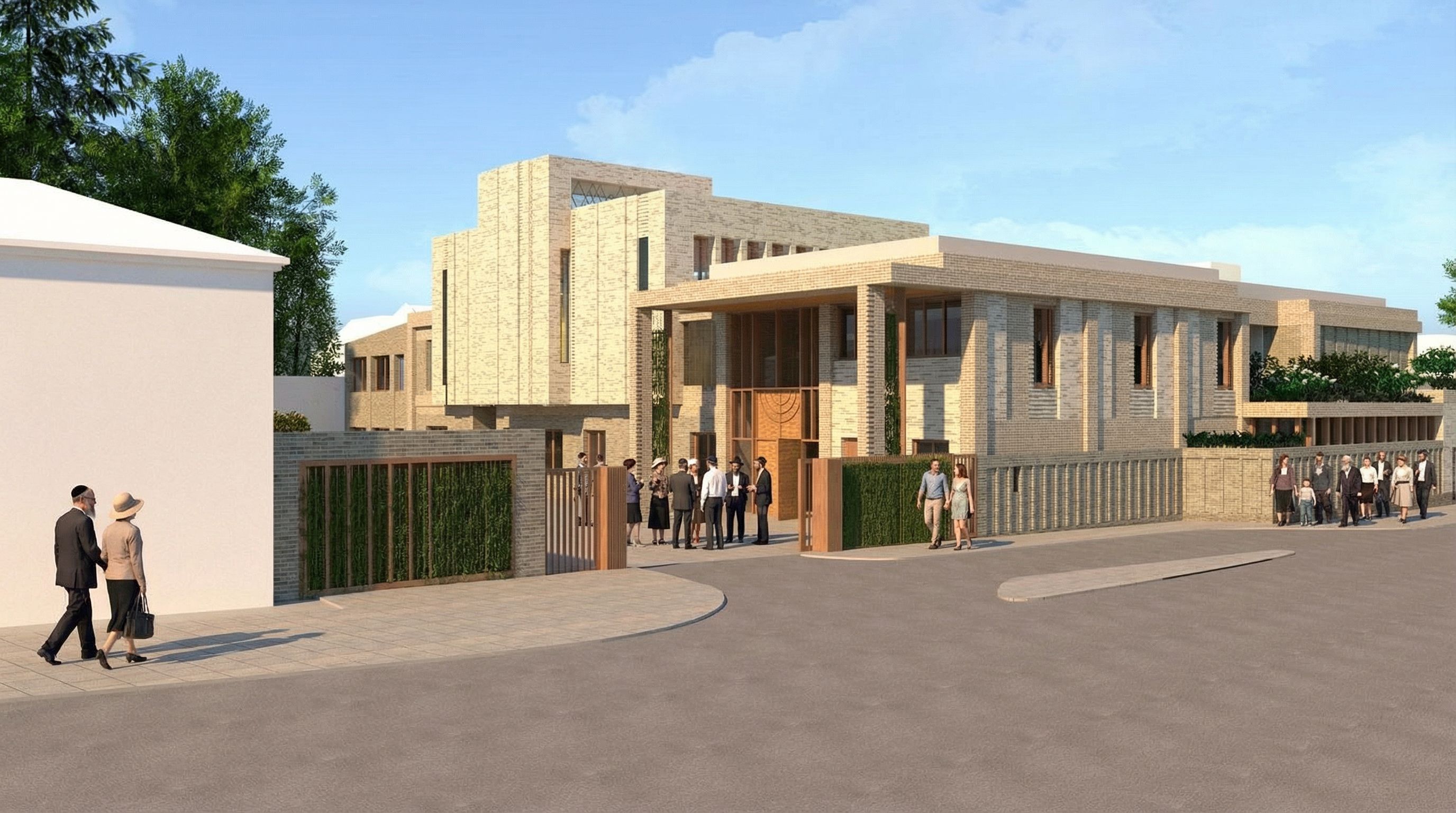 architectural exterior rendering, render this 3D mass into photorealistic rendering, This is an architectural render of a synagogue. Add a group of people under the canopy to the side of the door. Add a couple of people on the street on the right hand side. Keep peoples shadows on the right side of them. add a group of people like the reference photo on the far right hand side street path. not busy with people. Keep lighting direction the same and do not crop the image. the women need to wear hats like the reference images and the men in kippahs. a mix of ages. dont put anyone on the road or central island and minimal people with there backs facing the camera., keep exact camera angle, high quality, professional, detailed scene
