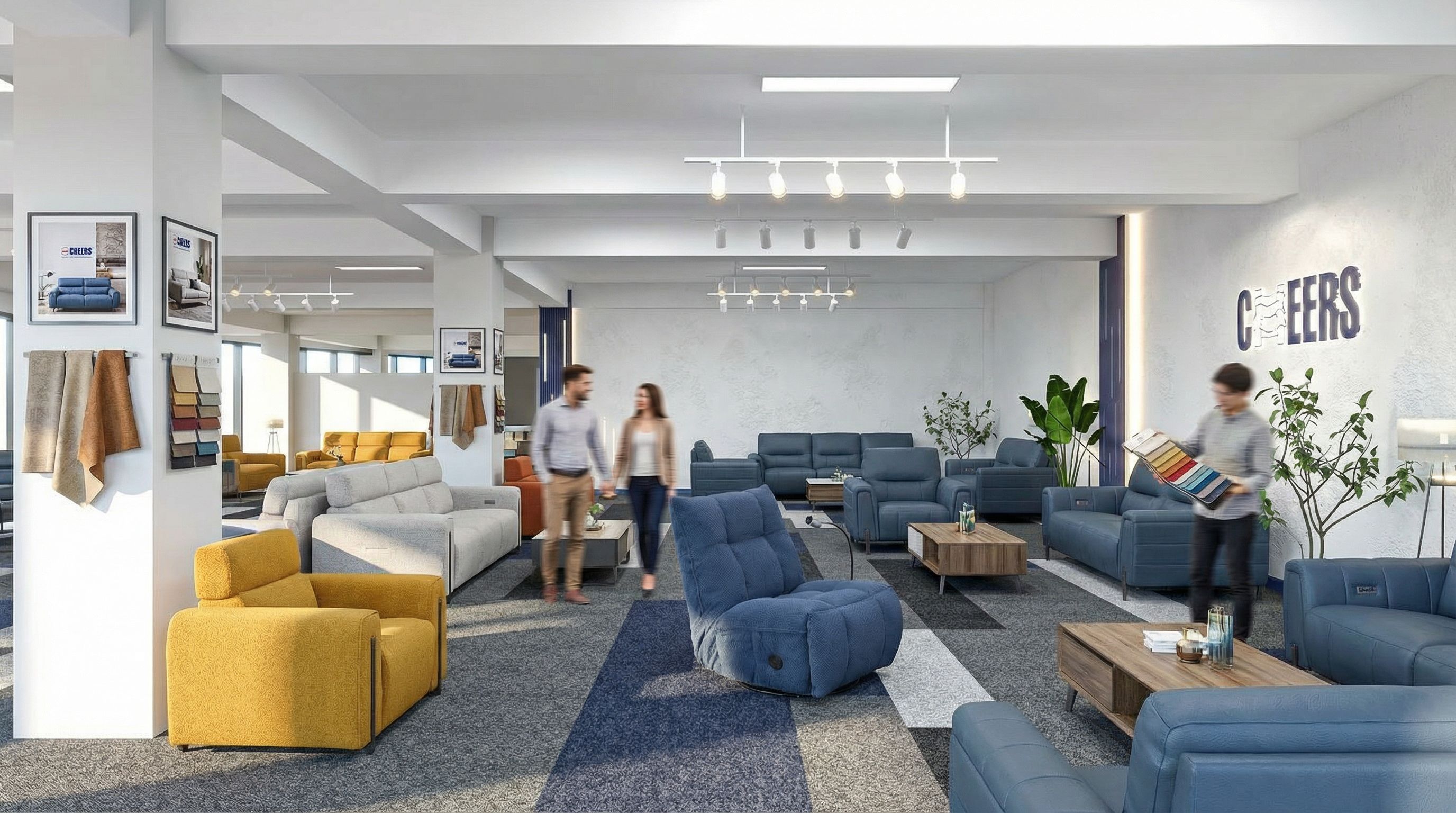 interior design rendering, render this photo into photorealistic rendering, Fill this area "CHEERS" brands sofas from reference section's products images. 10-15 pieces sofa and a few coffee table showroom. Add 3 blurred people male and female. One is holding sofa catalogue or fabric sample palette. Blur is motion effects about walking. Do not change building area's position and shape, other things. Decorate columns brands cozy vibe., eye level view, bright daylight, natural lighting, high quality, professional, detailed scene