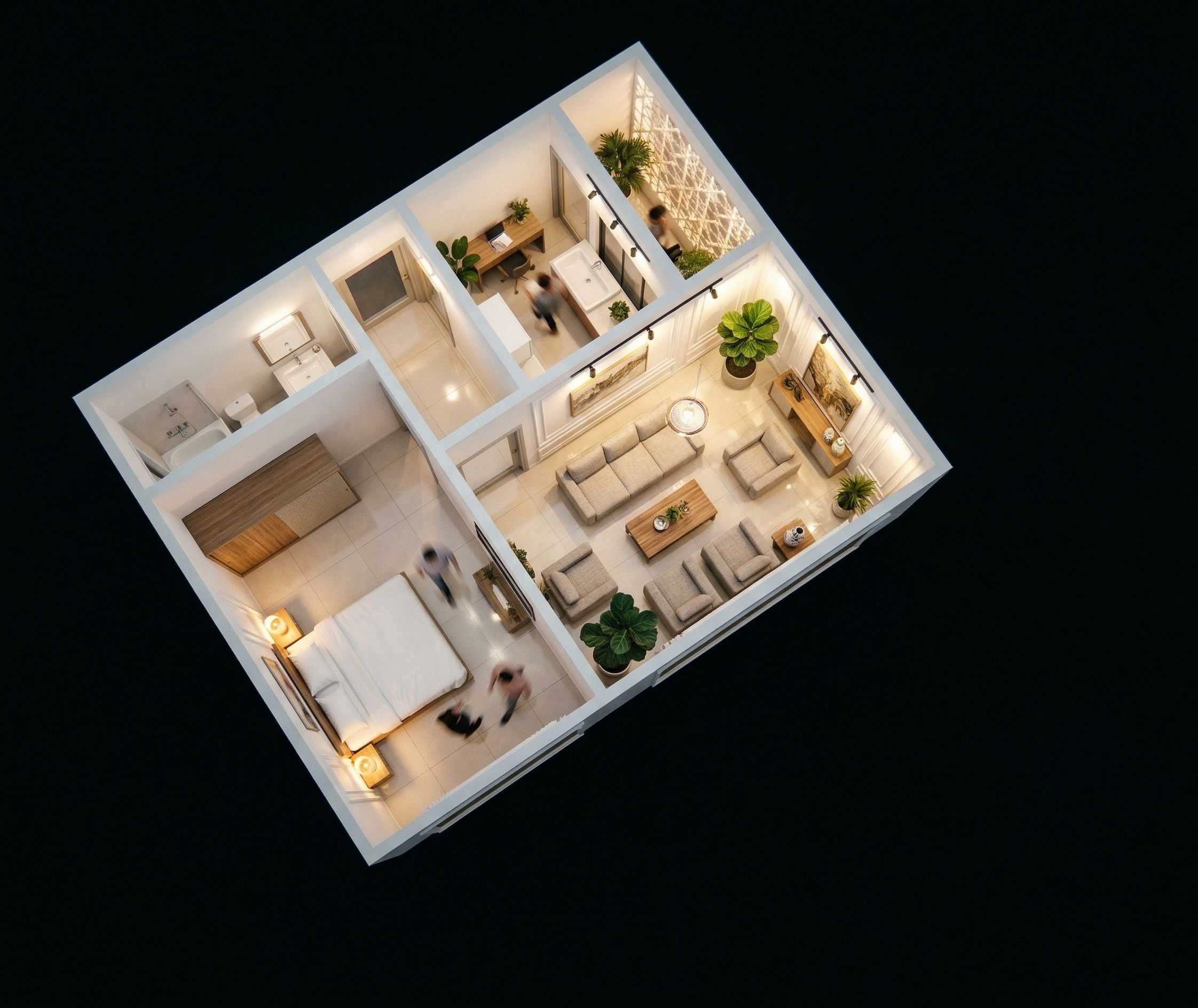 AERIAL VIEW OF A UNIT WITH LIGHTS TURNED ON IN THE HOUSE. , INCLUDE MOULDINGS IN WINDOWS AND OPENINGS. USE BRILLIANT WHITE ON THE WALLS . MAKE THE GLASS CLEAR, REALISTIC AND TRANSPARENT. USE CERAMIC TILES ON FLOOR. MAKE IMAGE BRIGHT HIGH RESOLUTION 8K WITH A BLACK BACKGROUND., keep exact camera angle