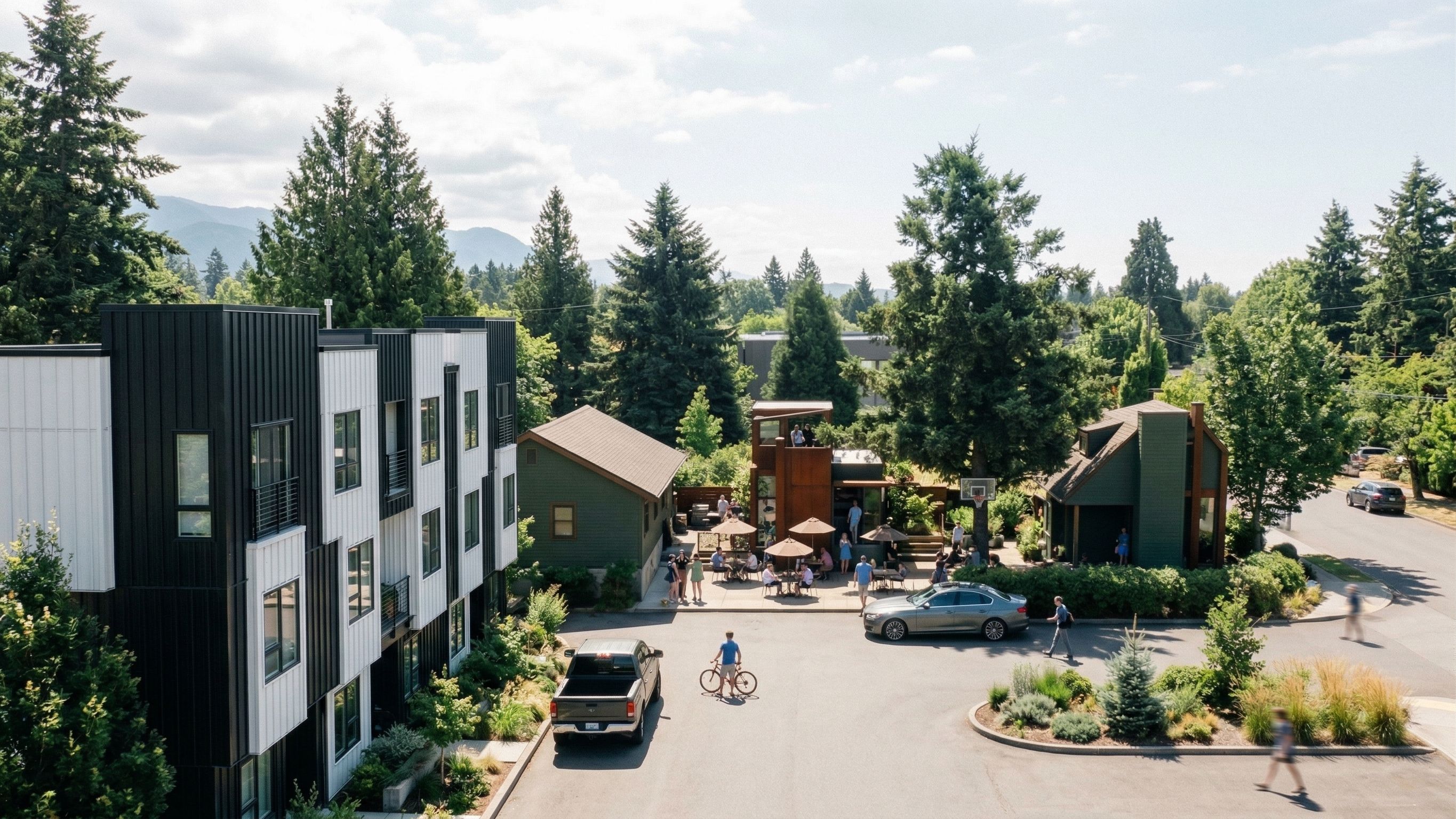 Promptuse rendered image and fill in surroundings as shown. change building on left to a three storey townhouse block with black and white vertival siding, keep exact camera angle