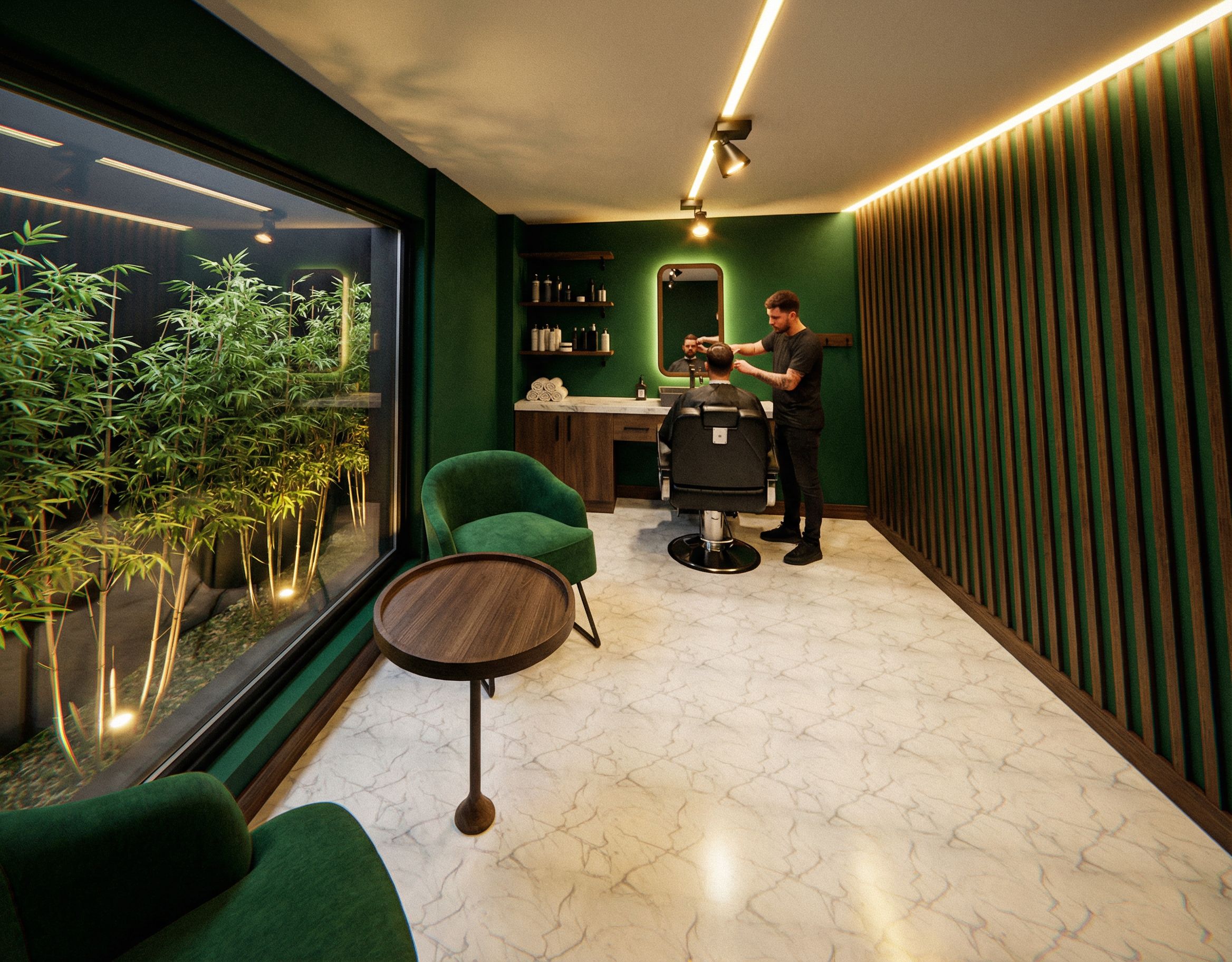 don change the angle and the furniture the ceiling has black spot lights in the middle which installeted on a railing system which also is a horizontal LED lights. On the right edge and the front edge the ceiling has 12 cm opening also for the LED lights. do not add extra spot lights. use the ones are on the picture On the right side the wall is covered with dark oak lamellen and as background emerald green the front wall is emerald green with satin texture colour. just as the wall on the left The counter top is white marmor and the cupboards beneath are dark oak. add bottles and towels on top of the shelving systemmake the whole system also in dark oak and the hinges beneath black. on the left wall there is a window display opening to a small garden which is planted with bamboo plans. that garden is covered with walls which are dyed in black left bottom corner there is a emerald green armchai. flooring is white marmor aswell. and the skirting board is out of dark oak. Make the coffe table is out of dark oak the rahmen of the window is dark oak make the lights warm yellowish. add also floor LED lights in the bamboo garden display. Add also LED lights behind the mirror, keep exact camera angle