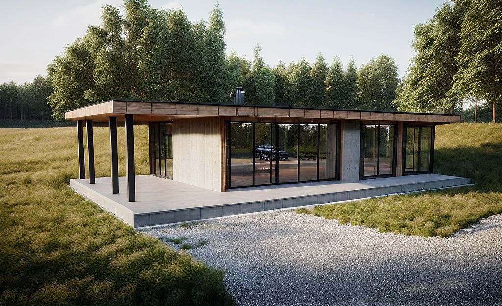 PromptModern minimalist house, concrete, wood paneling, glass windows, concrete porch, straight lines, geometric shapes, it is surrounded by a forest. bright daylight.