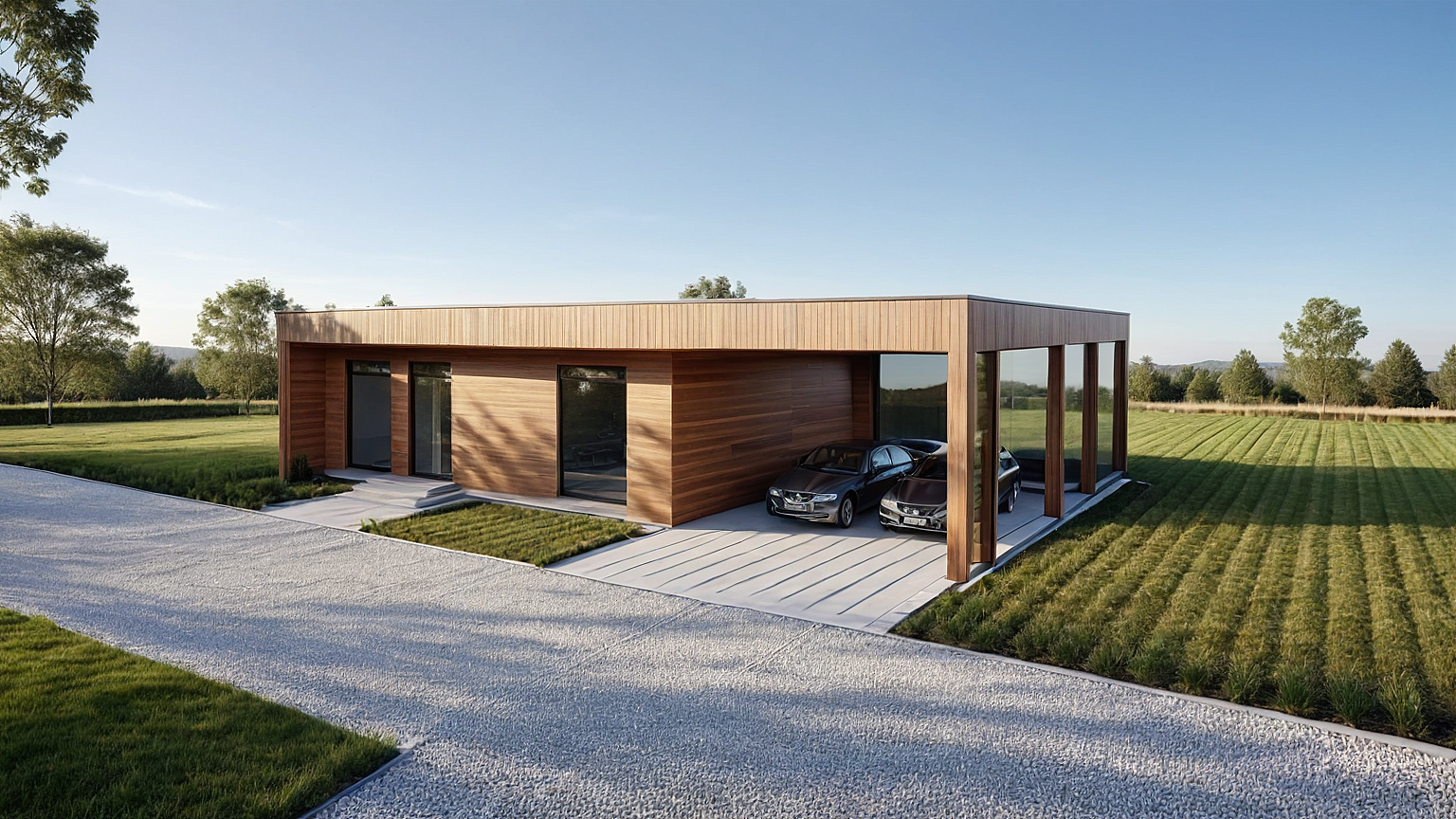 PromptModern villa, daylight, wood vertical and horizontal cladding, yard in background, grass, pile foundation, do not put glass windows in garage part,in background put forests entrance door are seperated from windows
