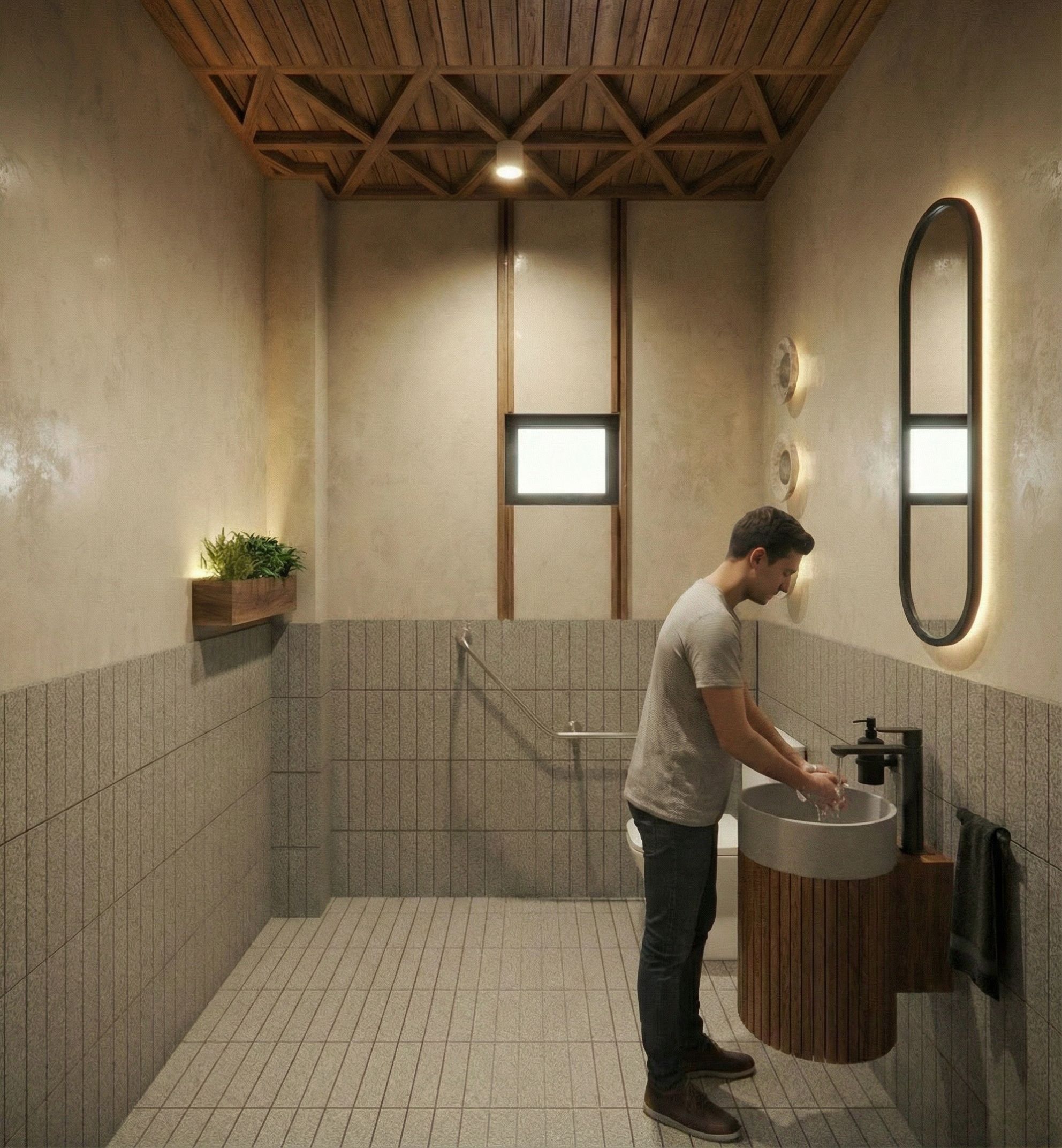Photorealistic rendering of a public restroom located in Plaza Paseo Rocaval, in San Cristóbal de las Casas, Chiapas.Organic, natural, and contemporary style, with a warm, realistic, and slightly theatrical atmosphere.The existing restroom layout must be fully respected.Materials and finishes: 7 x 30 cm ceramic tile flooring with a medium gray granite-look finish, also used on walls and wainscoting up to 1.20 m high, with a 3 mm visible grout joint. Upper walls finished with a chukum-type paste in a natural tone with a smooth, handcrafted texture.Sink and Vanity. Vanity in WALNUT wood with vertical grooves. Ceramic sink in a natural concrete-gray finish. Mixer faucet in a matte black finish. Bathroom accessories in black. MirroR. Oval mirror with a black frame and soft perimeter backlighting.Toilet White ceramic toilet with a contemporary design. Graphic Element: Natural Elements only one Planter in walnut wood as it was in te photo. Vertical elements in walnut wood flanking the window as an architectural accent. Ceiling and Lighting: Ceiling in walnut wood, respecting the original shape of the space. Small square recessed spotlights in the ceiling. Wall lights above the toilet with a natural stone or marble finish. Lighting: Warm, stage-like lighting with soft shadows and enhanced textures. Emphasis on wood, chukum, floor tiles, and graphic elements. Realistic, clean, and sophisticated atmosphere., keep exact camera angle,Remove the pictures, the girl, and the objects on the background paneling,remove flowerpots on floor. Respect the shape of the ceiling in the photo, as well as the location of the bathroom fixtures; remove the wood paneling below and above the window. remove the leaves that are visible on the mirror.remove the box on the right side,remove hanging planter under window,Remove the wooden box from under the window, place black bathroom accessories, and one person, keep exact camera angle