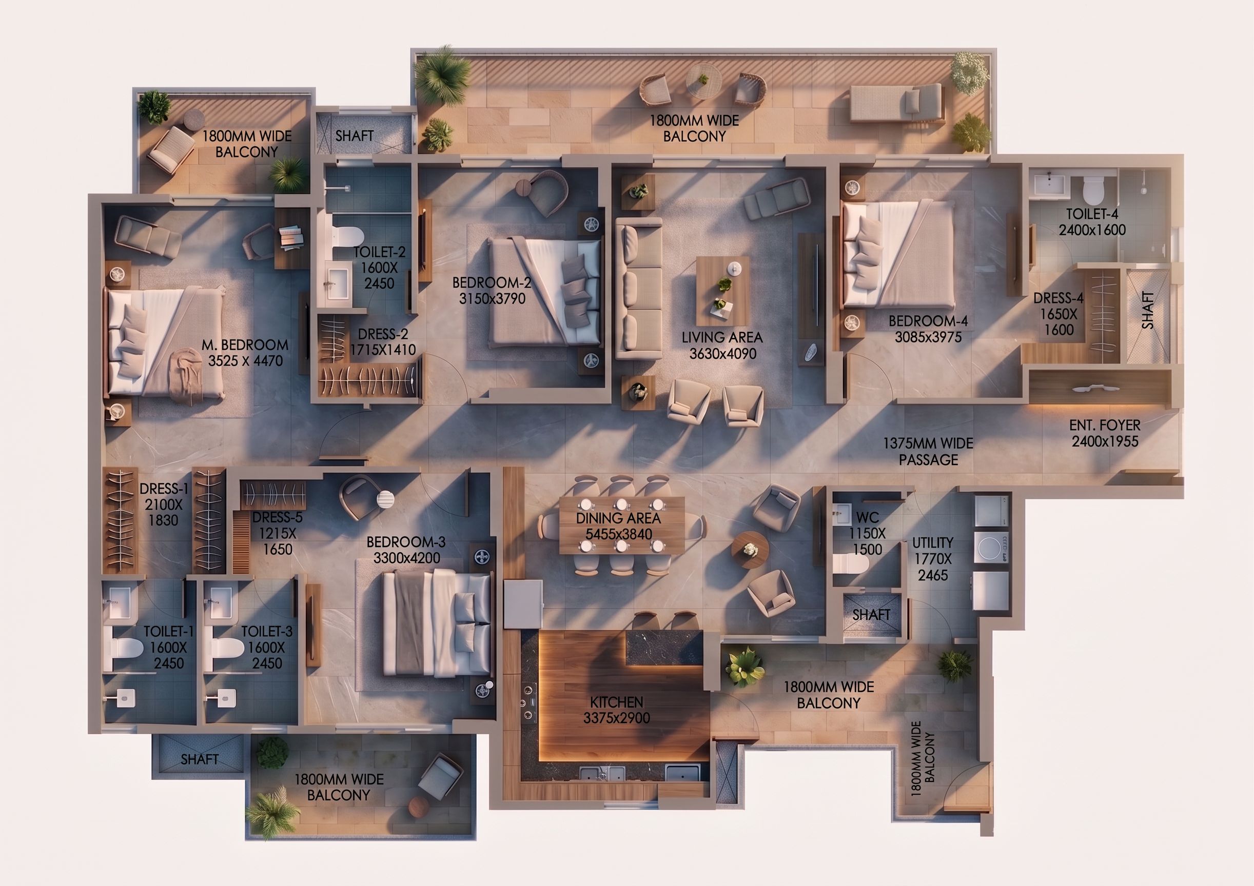 Lighten the shadows as they are very overwhelming. Replace all wooden flooring with tile flooring. Use the same tile flooring style already used in the bedrooms. Ensure tile color, pattern, and scale remain consistent across these areas. Do not change the layout, walls, furniture placement, camera angle, or overall style., keep exact camera angle