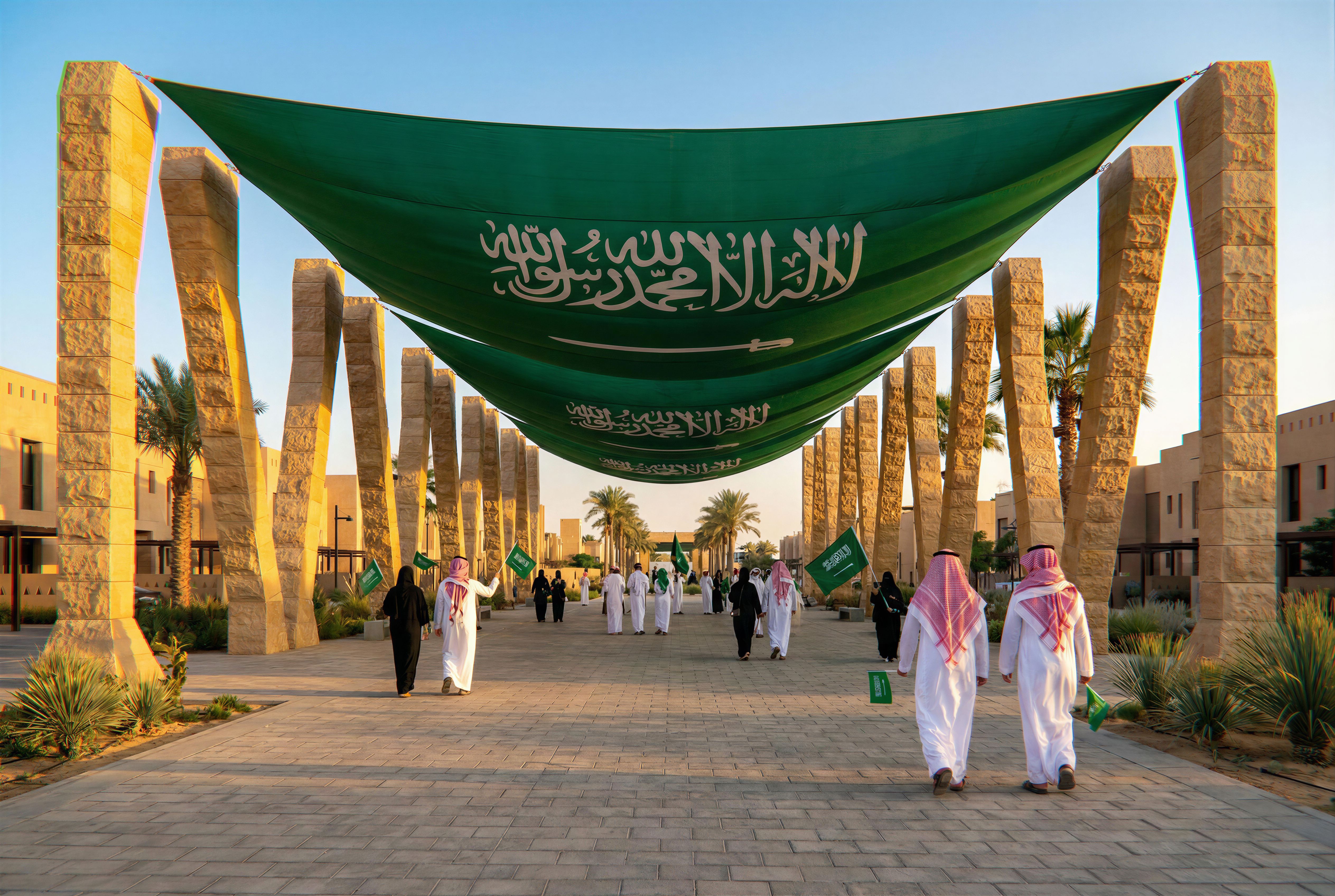 WALK WAY ON plaza in Roshn sedra district like reference image , Riyadh stone , BLACK IS SAUDI FLAG , Saudi national day celebrations, keep exact camera angle