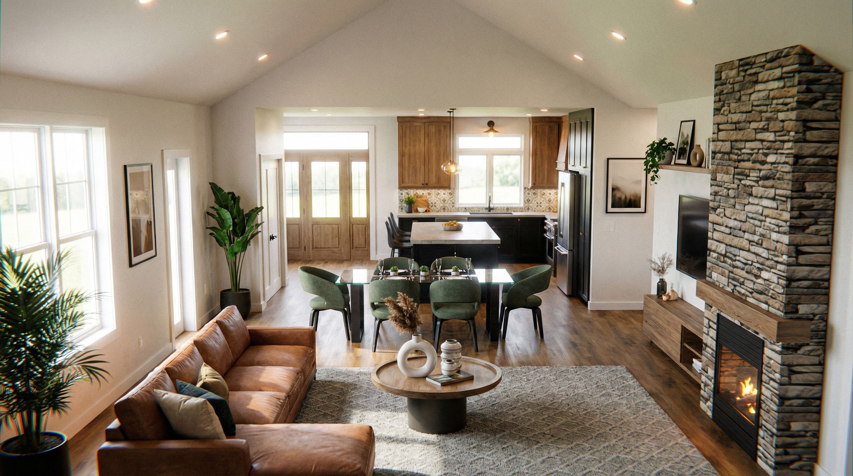 4k high quality image, real life, crisp, not blurry, plants and decor, black and wood tone cabinets, keep exact camera angle