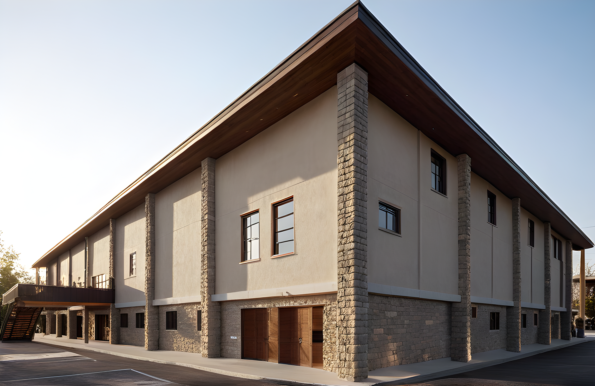 PromptThis is a light brown stucco building with stone columns and a wooden roof. The lower level has a stone exterior. On the right side of the building is a parking lot. Sun shining from the left side of building. Double doors at the lower level is brown