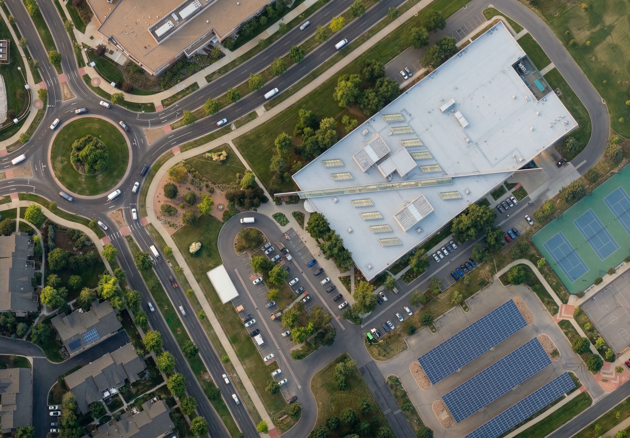 PromptKeep everything the same, but remove the green roof from the large building in the image.