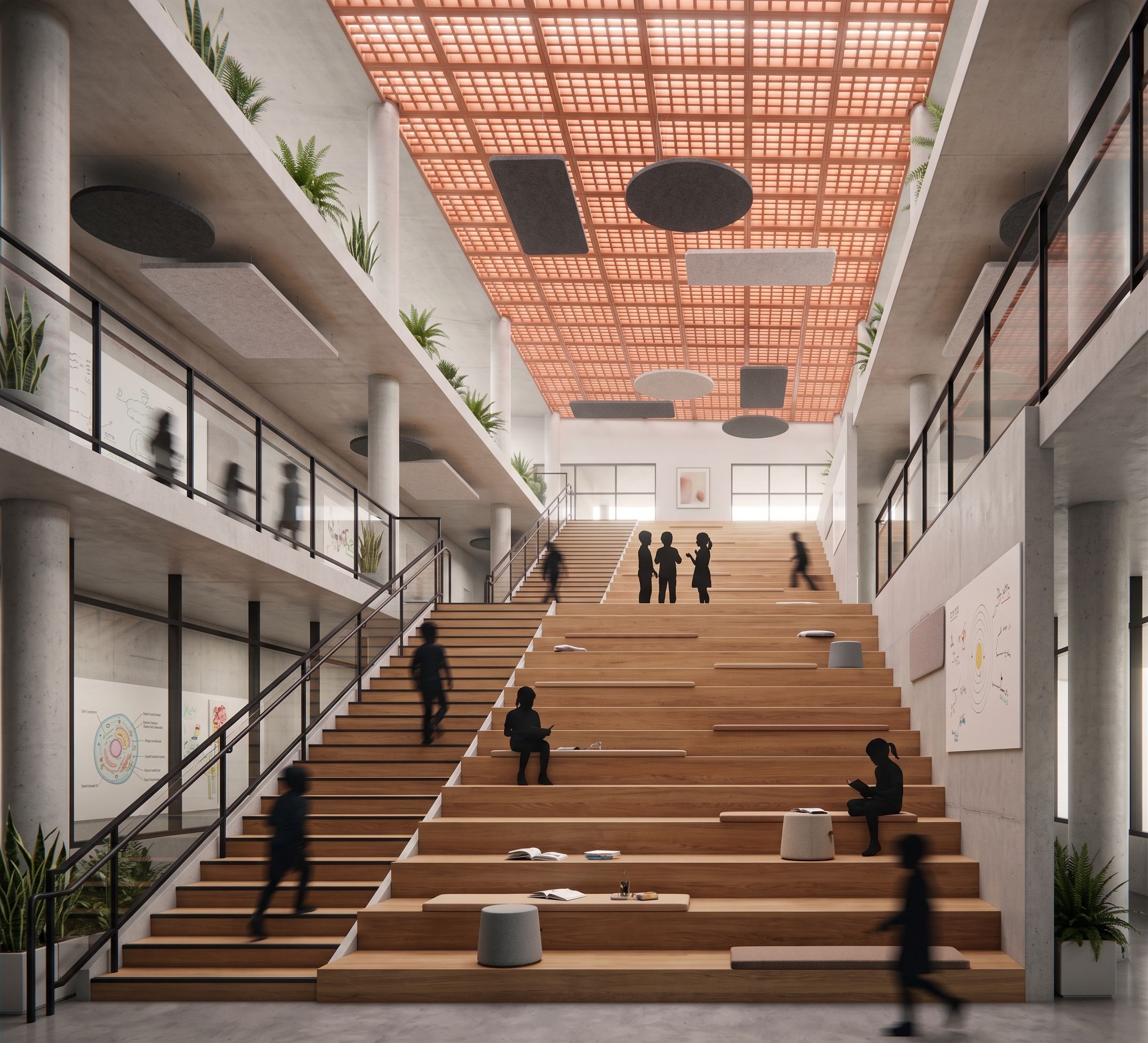 Enhance this architectural interior rendering while keeping the exact geometry, camera angle, and composition unchanged. Focus on the central learning stair and open corridor as a social and educational space. Style: Realistic Enscape rendering with subtle Photoshop post-processing. Clean, minimal, architectural. Lighting: Soft natural daylight from upper level and side openings. Slight warm tone. Add soft shadows and depth. No dramatic lighting. Materials: - Exposed concrete columns and slab light gray, smooth - Wood stair treads and seating surfaces warm tone - Metal railings matte finish - Polished concrete or terrazzo floor - Glass guardrails light reflection Learning Stair VERY IMPORTANT: - Transform stairs into seating space - Add subtle wood seating pads or cushions on some steps - Add students sitting, reading, talking People silhouettes ONLY: - Children silhouettes black, no detail - Mix of: - sitting on steps - walking up/down - leaning on railing - small group interaction on landing - Keep spacing natural, not crowded STEAM Elements: - Add whiteboards or pin-up surfaces along corridor walls - Light diagrams/sketches very subtle - Add a few small tables or stools at top or bottom of stair - Include books, notebooks, small learning tools Acoustics: - Add acoustic panels: - ceiling-mounted panels above stair round or rectangular - vertical acoustic panels along corridor wall - Keep minimal and clean Corridor Activation: - Add a few students walking along upper corridor - Keep corridor open and visually connected to stair Atmosphere: - Calm, collaborative, active learning - Slight depth haze - Balanced composition Post-processing: - Slight contrast and warmth - Soft shadows - Light sharpening - Minimal grain IMPORTANT: - DO NOT change architecture - DO NOT move railings or stairs - DO NOT overcrowd space - Keep everything clean and intentional the toop screen in the roof is terracota openings it's and open coridoor show people as little kids keep everything the same please keep the railing the same , keep exact camera angle