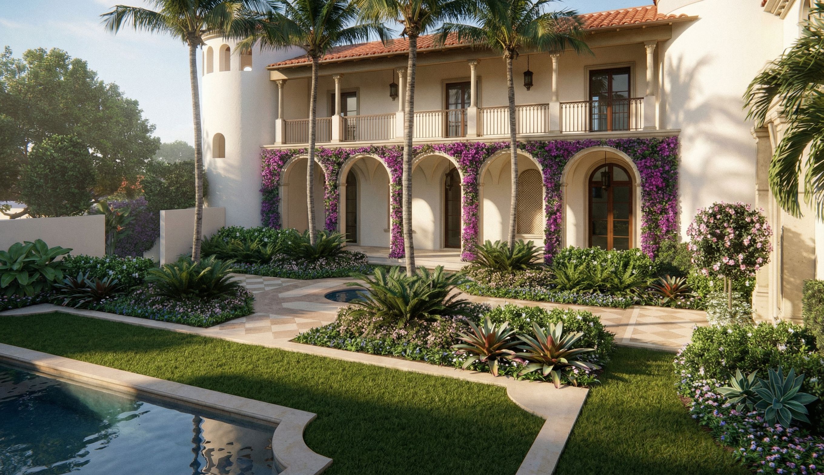 The final image should look like a real photograph of a multimillion dollar Palm Beach Mediterranean Revival villa with refined, lush, and elegant landscaping.