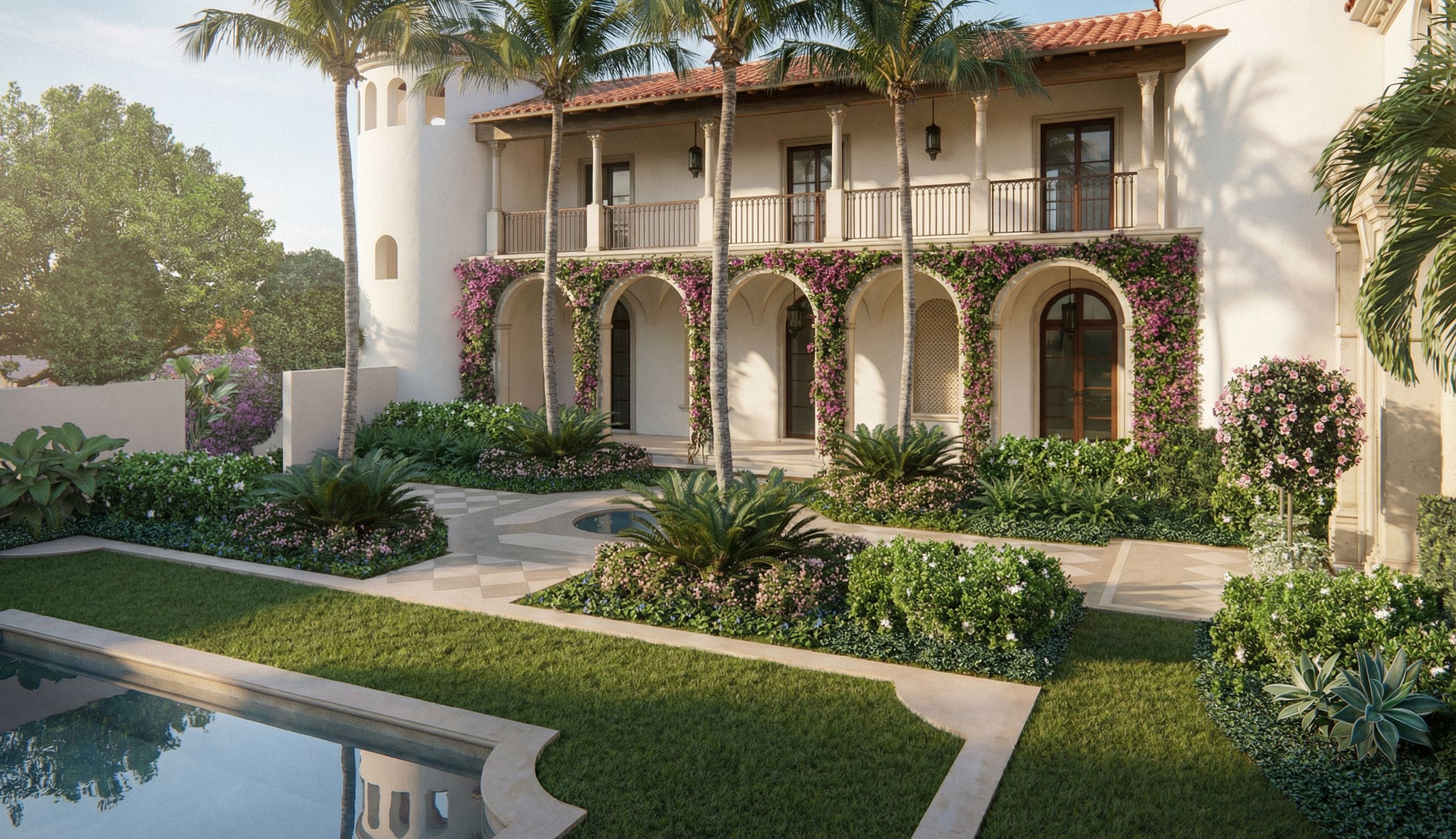 Ultra photorealistic architectural rendering of a Mediterranean Revival residence in Palm Beach, Florida using the uploaded image as the exact visual reference for both the architecture and the landscape layout. This should feel like a romantic secret garden. The uploaded image defines the exact building massing, architectural elements, hardscape layout, reflection pool, planting bed locations, lawn areas, palm placement, vine locations, and overall garden composition. Preserve all of these exactly as shown. Do not alter the architecture in any way. Do not change the massing, roof shapes, tower geometry, arches, column spacing, balcony layout, paving layout, pool shape, window placement, door placement, or any architectural detail. Do not add new windows, doors, openings, or architectural features. Do not redesign the landscape layout. Maintain the exact placement of all planting beds, lawn areas, palms, vines, and hardscape as shown. Maintain all existing grass areas and planting bed boundaries exactly as they are. The areas surrounding the reflection pool that are shown as grass in the reference image must remain grass. These areas are lawn, not water. Do not convert any grass areas into water, paving, or planting. The grass should remain continuous, green, and clearly defined as lawn adjacent to the pool. The water element in the foreground is a reflection pool only. It is a single contained body of water with clearly defined edges. Keep the pool exactly as shown in shape, size, and boundary. Do not expand the pool. Do not extend water beyond the existing pool edges. Do not connect the pool to any surrounding surfaces. There must be a clear visual separation between the reflection pool and the surrounding grass. The pool should read as an independent, contained feature within a lawn setting. Within the existing planting beds only, enhance the landscape to feel more lush, layered, and immersive, like a refined tropical secret garden appropriate for a luxury Palm Beach Mediterranean Revival estate. Do not place planting in new locations. Do not expand planting beds into lawn or paved areas. Do not add new landscape features or objects. The architecture should remain a refined Palm Beach Mediterranean Revival estate with smooth hand troweled white stucco, terracotta barrel tile roofing, limestone at the primary surround, cast stone columns and trim, mahogany doors and windows, cypress soffits and beams, and limewashed cypress rafter tails. All materials should appear extremely realistic with subtle natural variation and high end detailing. Enhance planting within the existing beds by adding more layered, lush, and textural planting typical of a high-end Palm Beach tropical garden. Use a refined composition including structured hedges, layered tropical foliage, sculptural plants such as cycads or agave, low flowering shrubs, and controlled color accents in soft pinks, whites, and purples. Maintain bougainvillea in its current locations and enhance it to feel fuller and more natural without covering the architecture. Keep palms in their exact locations but enhance them to feel more mature and natural. Visually soften and screen the perimeter site wall using taller and denser planting within the existing beds adjacent to it so the wall recedes into the background. The overall landscape should feel like a lush, romantic tropical secret garden, but still curated and architecturally appropriate. Hardscape must remain exactly as shown with more realistic material texture and variation. Lighting should resemble luxury architectural photography in Palm Beach with warm late afternoon sunlight, soft shadows, subtle atmospheric haze, and slight coastal humidity. Camera composition should remain consistent with the original perspective. The final image should look like a real photograph of a multimillion dollar Palm Beach Mediterranean Revival villa with refined, lush, and elegant landscaping. Do not modify architecture, massing, hardscape layout, pool shape, planting bed locations, lawn areas, or tree placement. Only enhance planting within existing beds. Subtle humidity in the Florida air, soft atmospheric haze, slightly warm coastal light., keep exact camera angle