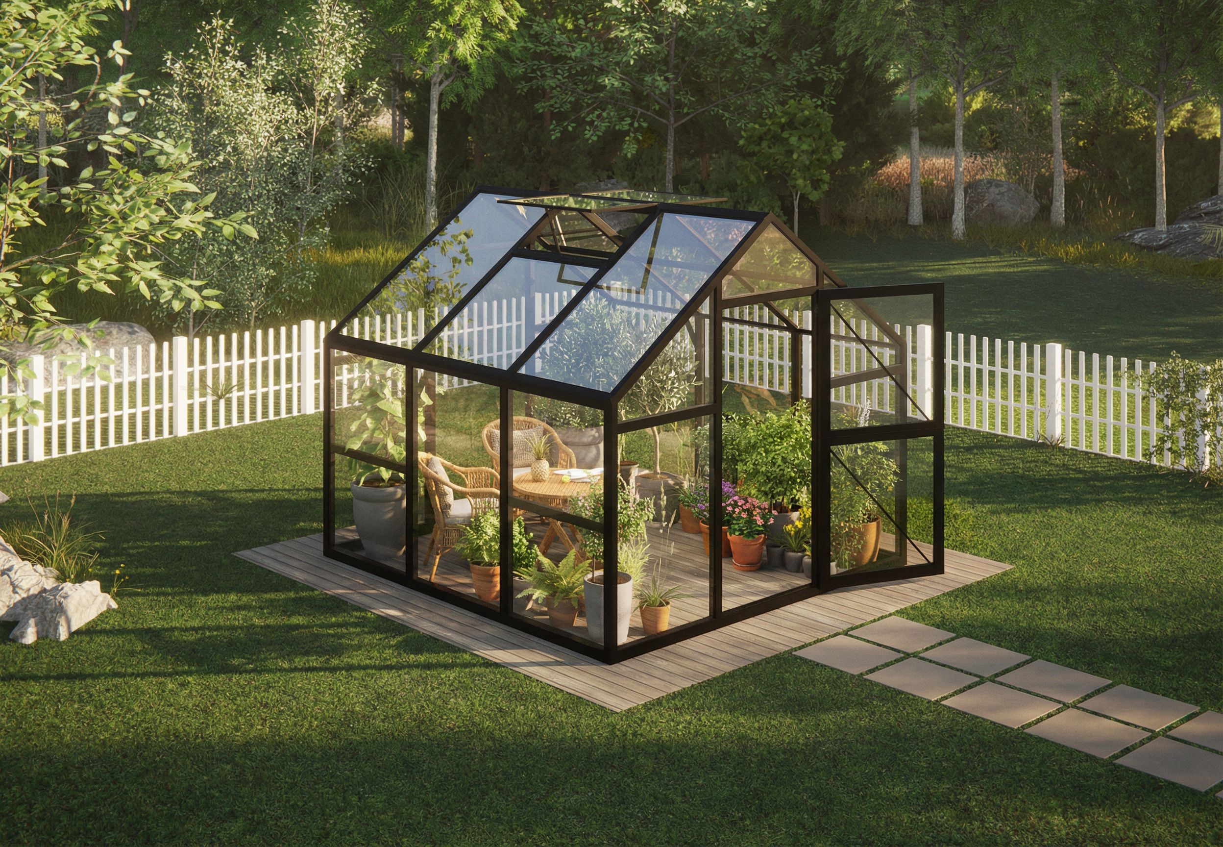 PromptMake more realistic. better lighting and shadows and plants. Change furniture and plants inside, keep exact camera angle