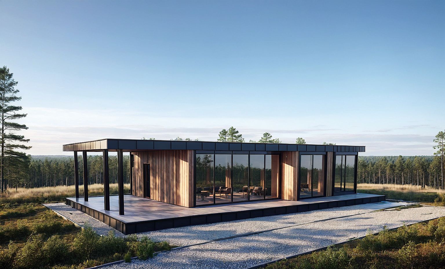 PromptModern minimalist house, wooden panels, glass windows, straight lines, geometric shapes, iron sheets and wooden planks, surrounded by forest.