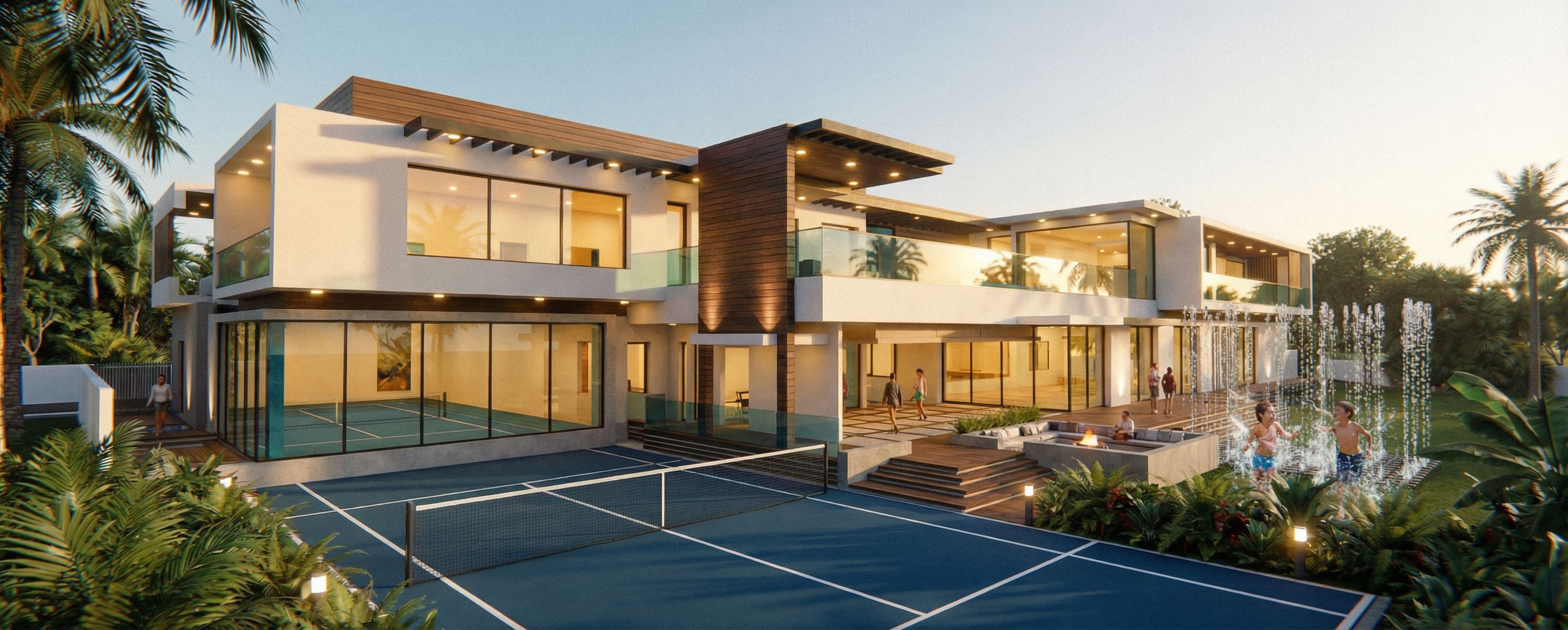 PromptAGREGAR LUZ TENUE DENTRO DE LA CASA. LUMINARIAS BAJITAS EN EL JARDIN. ELIMINAR EL JARDIN ENTRE LA CNACHA DE PADDLE Y LA FUENTE. COLOCAR ALGUNOS REFLECTORES EN EL JARDIN ILUMINANDO LA FACHADA, keep exact camera angle