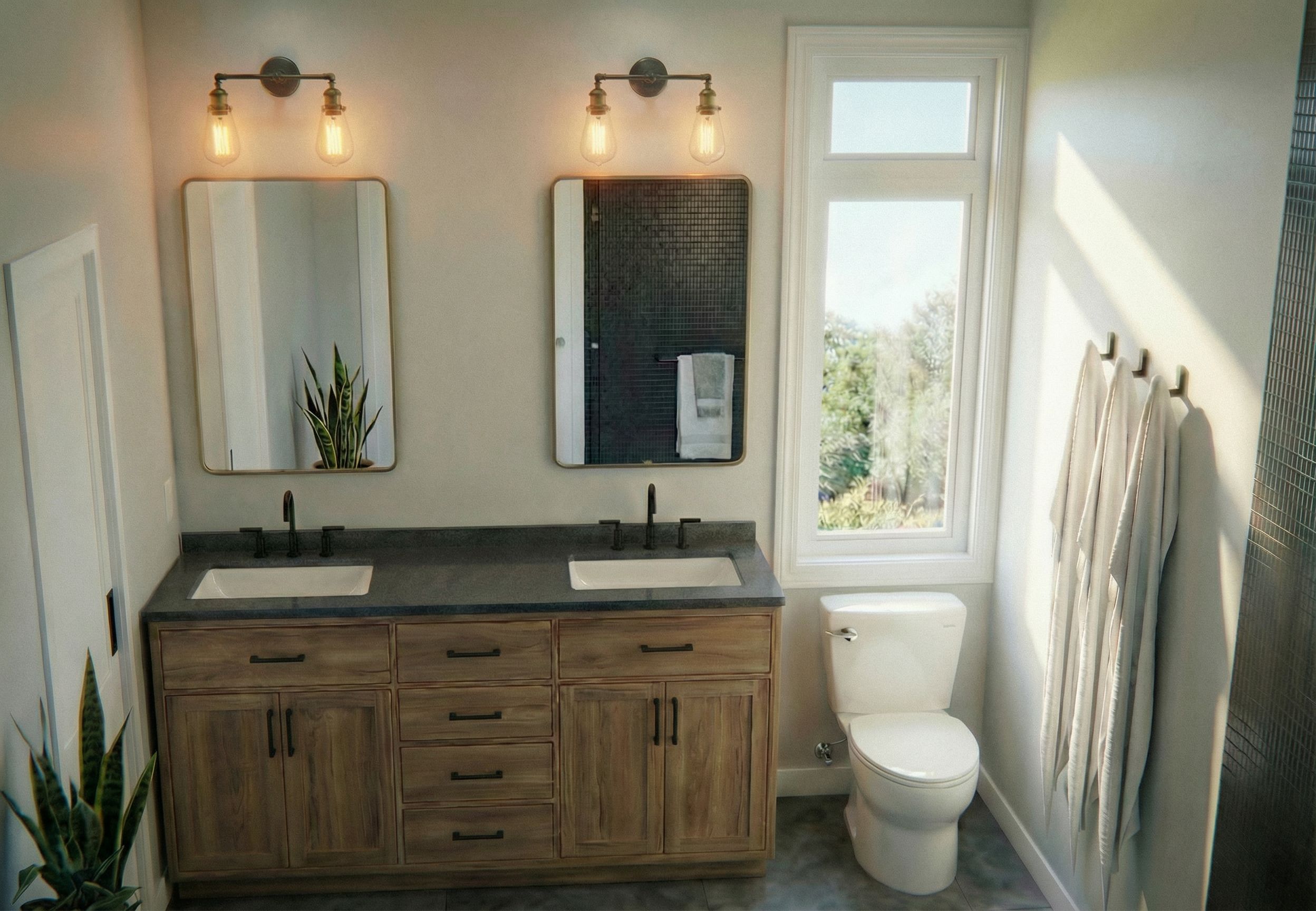 lets add some pretty 2 bulb edison style wall snoces above the mirrors, add a toilet lever to the toilet, change the door knobs to flush pocket door style handles, make the window white and add surrounding trim, black cabinet handles , keep exact camera angle