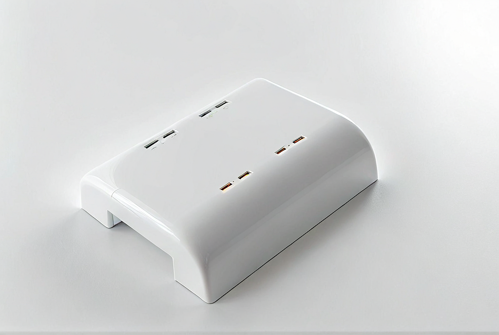 Promptplug in one piece, white pvc, glossy surface, 4 rectangular outlets on the top, floating in white void