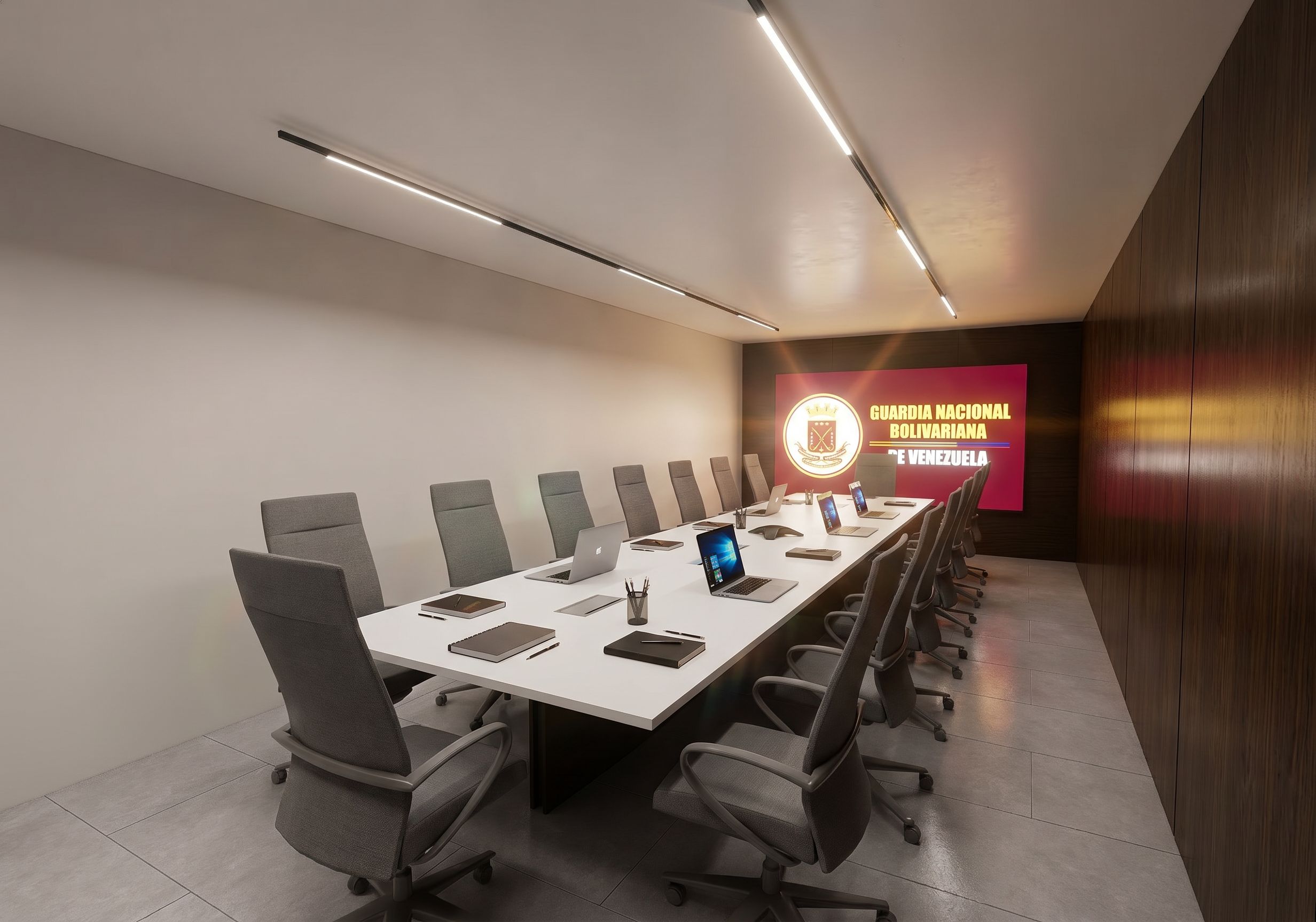 CAMBIA COLOR MESA A COLOR BLANCO, Y LAS SILLAS A COLOR GRIS PORFAVOR, AÑADE EFECTO DE LA ILUMINACION, Y EL EFECTO DE QUE EL TELEVISOR ESTA ENCENDIDO EN LA MESA AÑADE ORDENADORES, ES LA SALA DE REUNIONES DE LA GUARDIA NACIONAL BOLIVARIANA DE VENEZUELA, keep exact camera angle