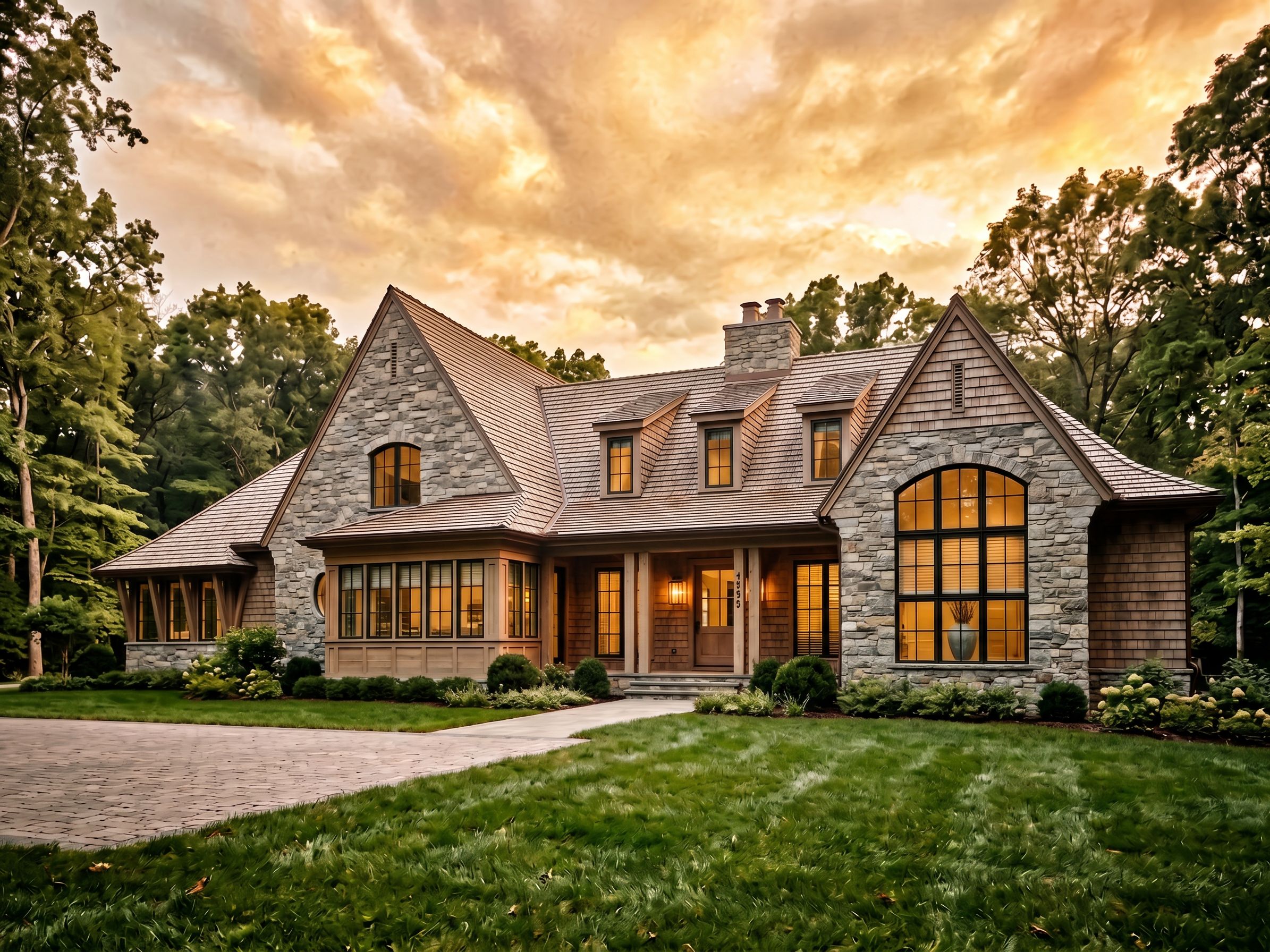 Photo of a contemporary residential home, showcasing intricate stone and wood elements. The façade features large windows framed by elegant stonework and a steeply pitched roof with textured shingles. Set in a serene suburban landscape with trees in the background, emphasizing a tranquil environment. Natural lighting during the late afternoon creates soft shadows and highlights on the surface, enhancing the architectural details. Captured from a frontal perspective with a wide-angle lens, emphasizing the breadth and elegance of the structure.