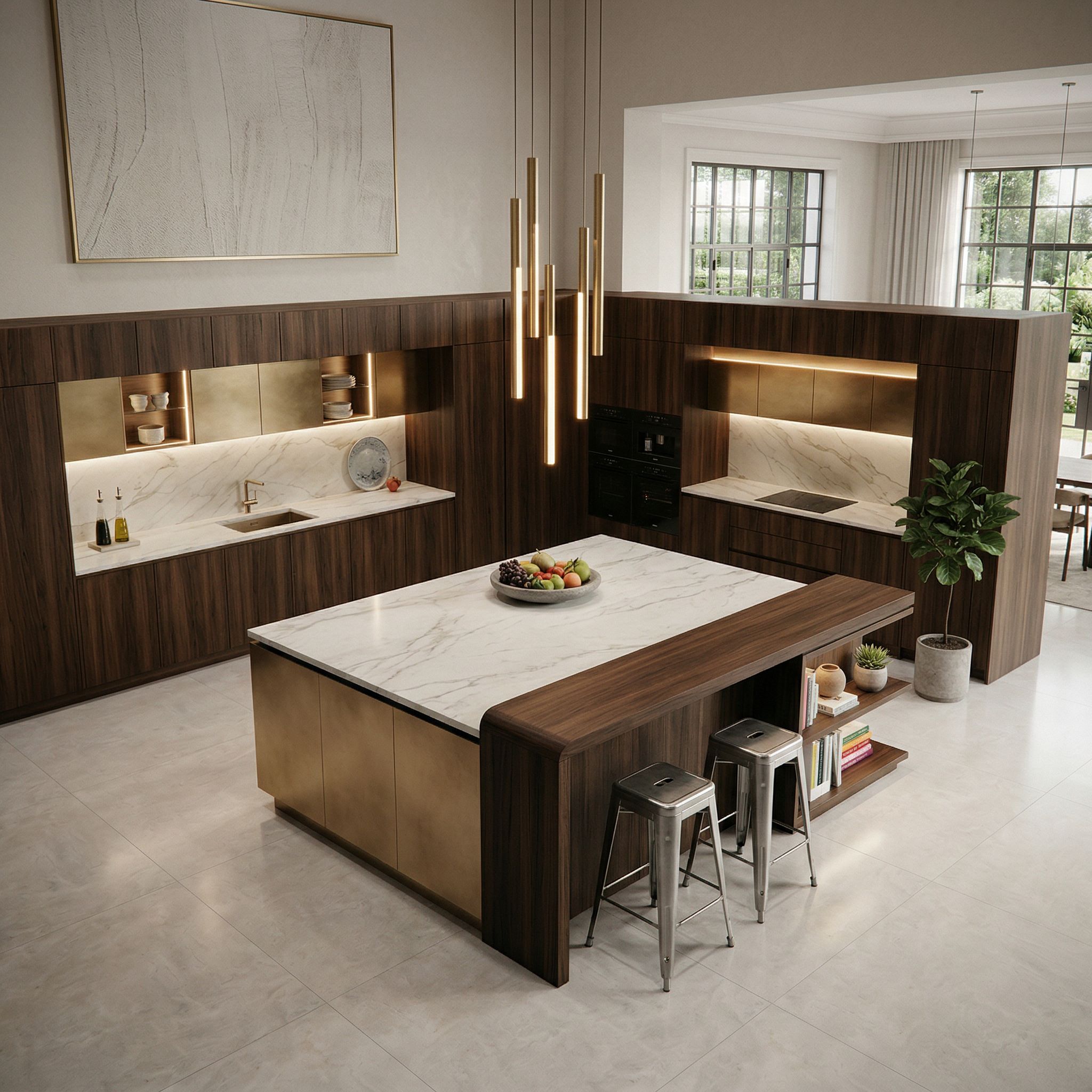 eliminate the second island and move the same breakfast bar in the main island shorter breakfast bar, keep exact camera angle
