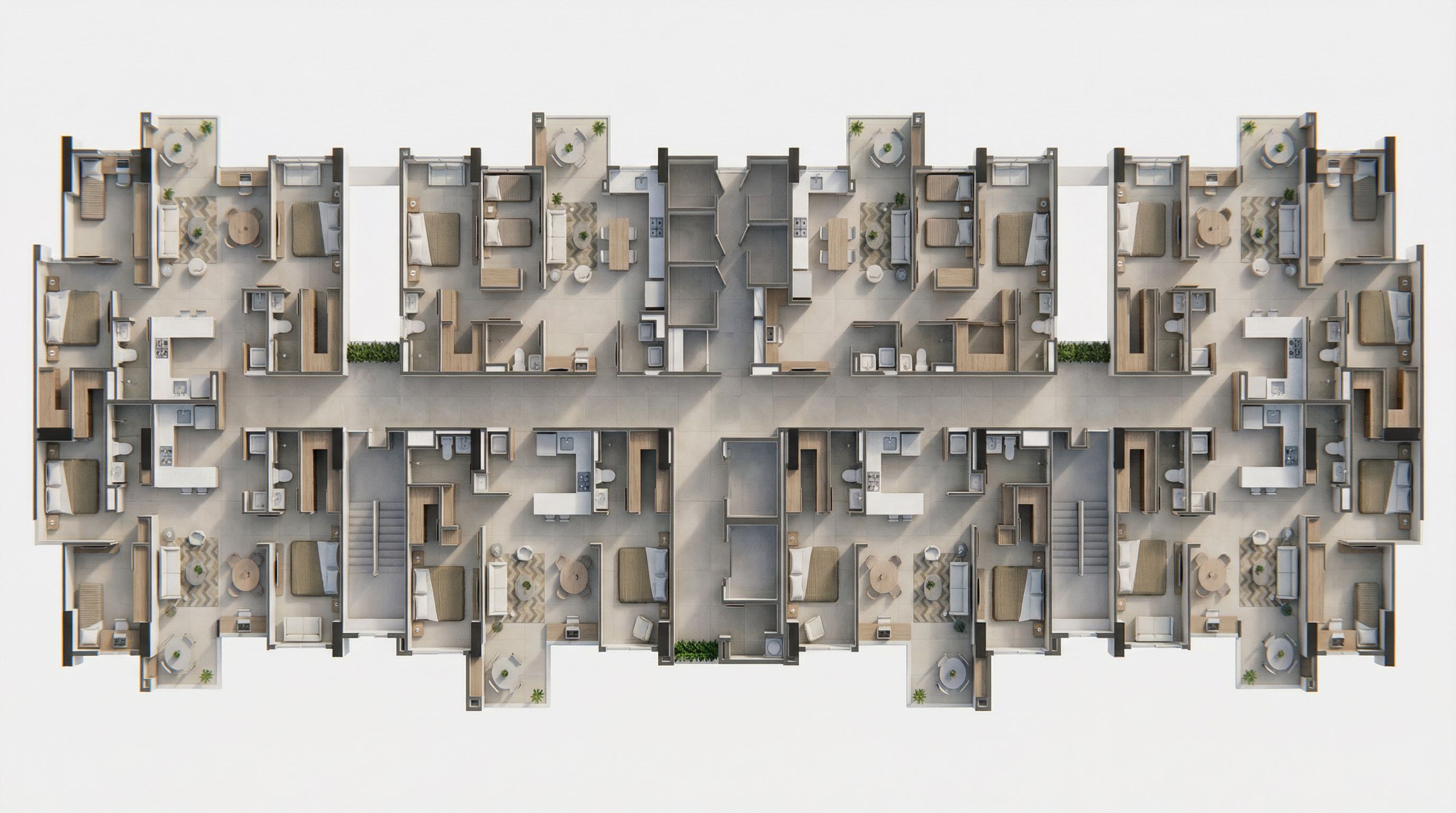 Generar una planta arquitectónica ambientada hiperrealista, respetando 100% la arquitectura original de la planta base adjunta, sin modificar muros, vanos, proporciones, circulaciones, ni distribución espacial. No alterar estructura, espesores de muro ni ubicación de puertas o ventanas. Basarse en el amoblamiento de la imagen base para volverla hiperrealista. Condiciones Obligatorias de Arquitectura: Mantener exactamente la geometría, modulación y layout de la planta base, No reinterpretar espacios, No agregar ni eliminar elementos constructivos, Conservar proporciones reales, Mantener sombras naturales coherentes con iluminación arquitectónica, evitando que la imagen quede oscura. No recortar imagen. Especificaciones de Acabados Aplicación estricta: Piso general de todo el apartamento: Porcelanato Orbit Greige formato 60x60 cm extraer de la imagen de referencia 1, Instalación alineada, junta mínima, Textura mate realista, Continuidad en todos los espacios sin cambios de material. Cocina: Mesón en Quarzstone Blanco Polar, Pozuelo en acero inoxidable, Cubierta mixta marca Haceb extraer de la imagen de referencia 1, Nevecón cualquier referencia moderna, acabado acero inoxidable, Mantener proporciones reales de electrodomésticos, Muebles modernos, líneas limpias, diseño contemporáneo, No incluir mueble alto de cocina. Baños: Sanitarios Montecarlo alongado color blanco extraer de la imagen de referencia 1, Respetar ubicación exacta en plano, Diseño moderno, sobrio, No incluir mueble superior de cocina. Closets y vestieres: Acabado en madera Rovere marca Pelikano extraer de la imagen de referencia 1, Textura realista, tono natural, Diseño moderno minimalista, Cada habitación tiene un vestier o un closet. Ambientación General: Estilo moderno contemporáneo, Mobiliario moderno, líneas rectas, colores neutros. Decoración sobria y elegante. Iluminación natural equilibrada. Sombras suaves y realistas, sin oscurecer la escena. Render tipo vista superior tipo planta ambientada 3D. Alta resolución, materiales físicamente correctos PBR. Sensación de amplitud y calidez. Parámetros Técnicos Recomendados: Render hiperrealista, Global illumination activada, Sombras suaves, Balance de blancos neutro, Sin sobreexposición, Nitidez alta, Escala humana coherente.
