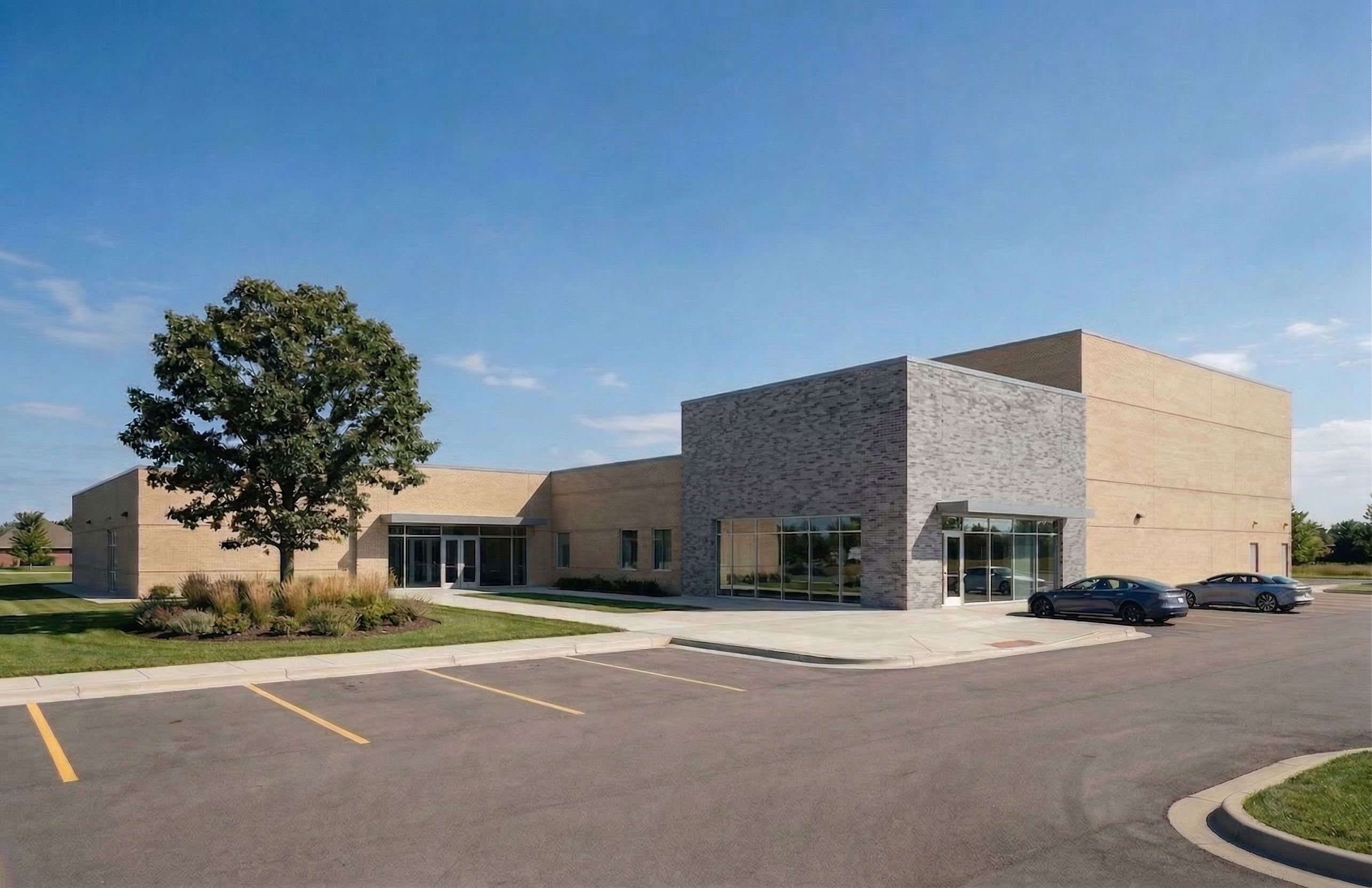 PromptReplace the glass above the canopy and the glass at the same height on the adjacent wall to be the same grey brick as the rest of the wall. replace the glass above the canopy in background with brick as well. make no other changes to the image., keep exact camera angle