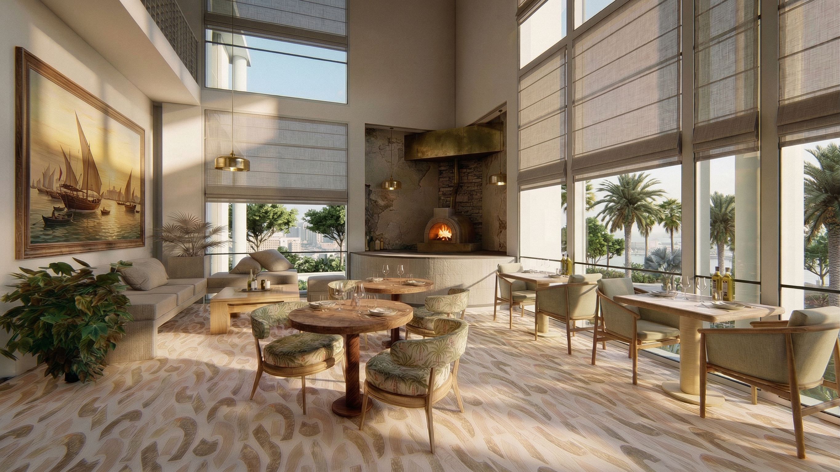 PromptThe Cafe is in the ground floor. Show trees and palm trees outside, keep exact camera angle