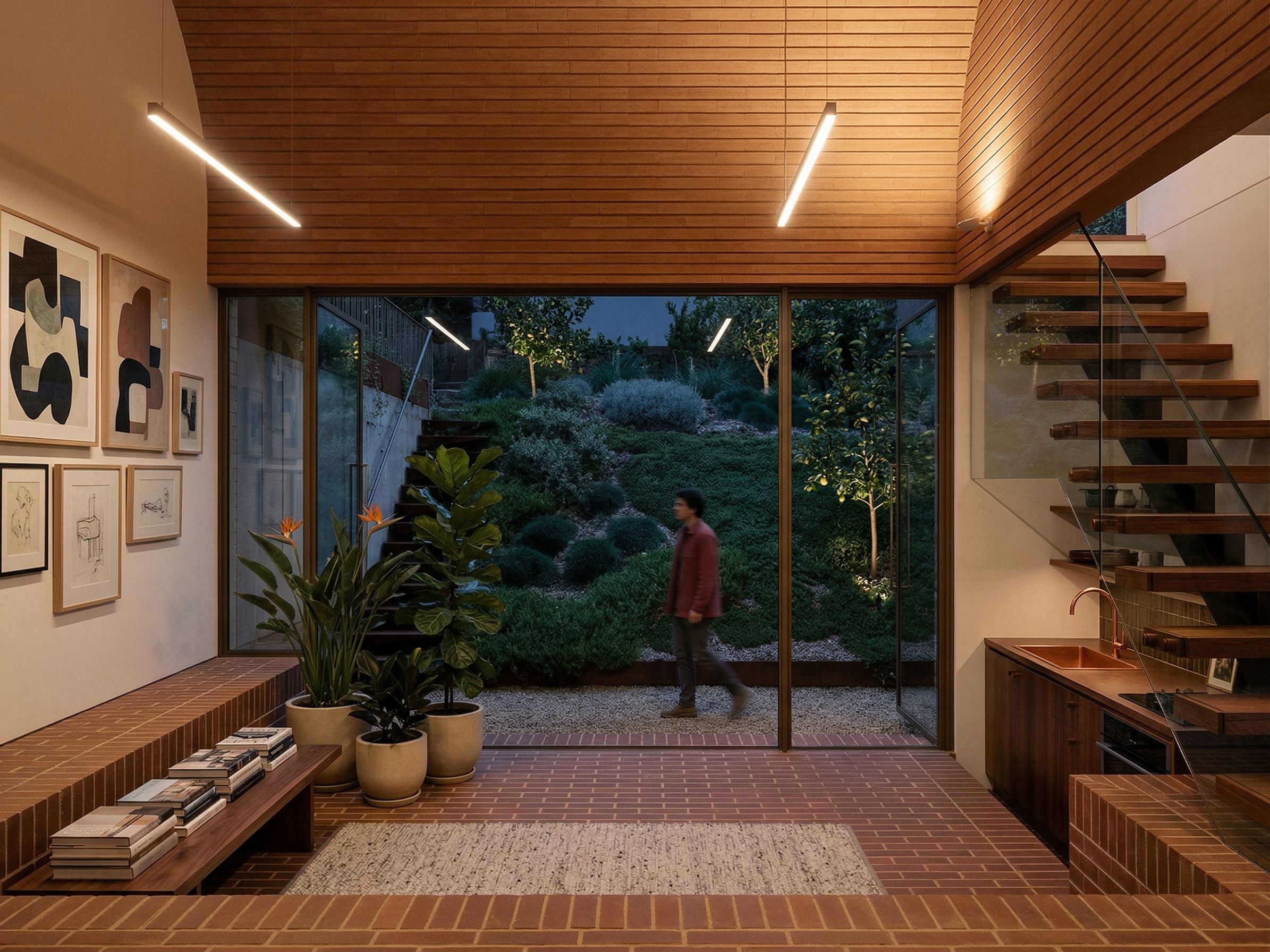 Promptinterior of a lower studio looking outside into a small orchard with a foreground sunken patio with a landscaped edge. Use existing view angle., keep exact camera angle