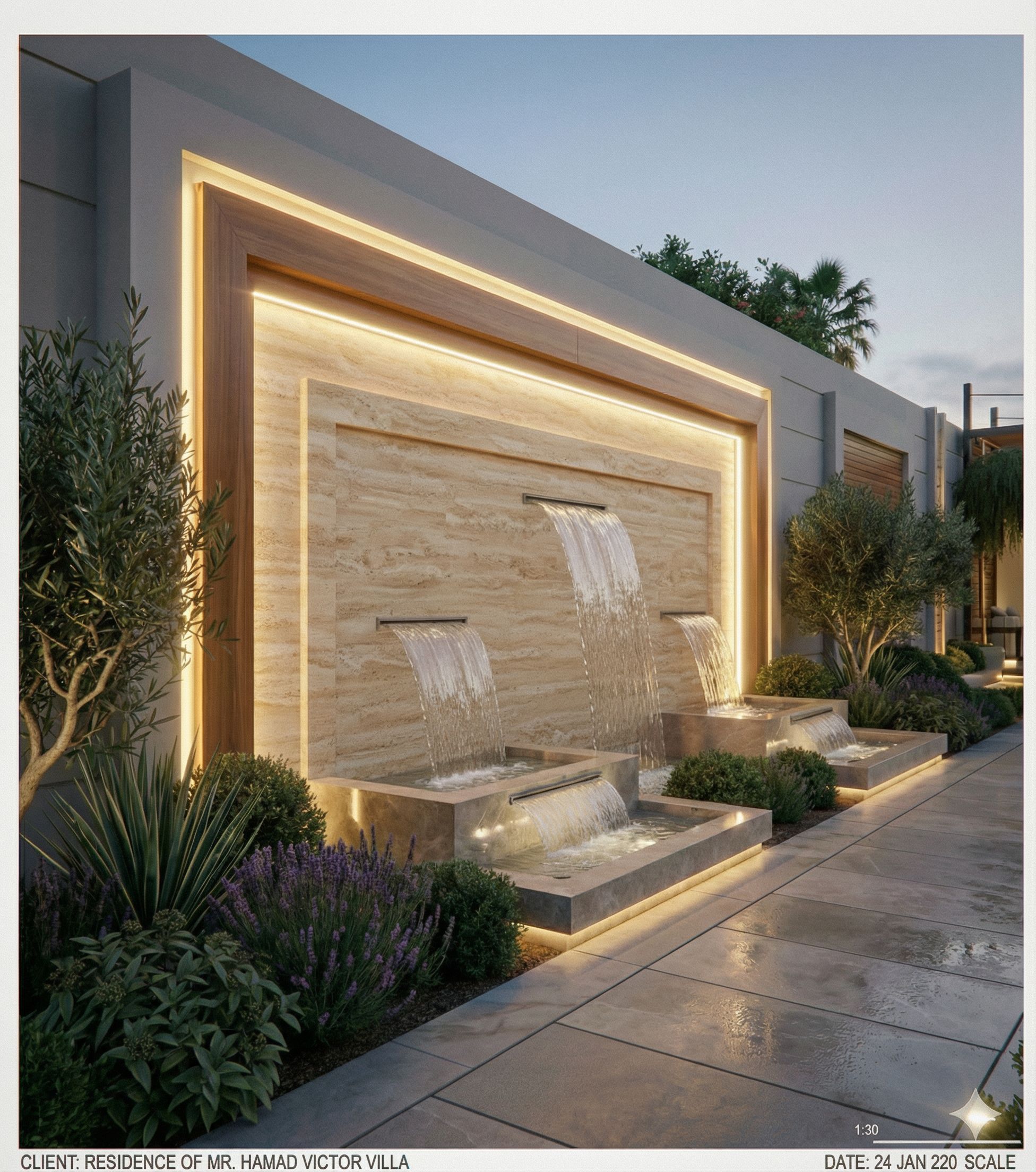 PromptMAKE THE TWO SMALL FOUNTAINS SAME AS THE REFERENCE PHOTO DEISGN FOUNTAIN, keep exact camera angle